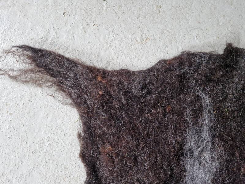 Dubbelzijdig te gebruiken kleed van wol van Zwartbles, Bergschaap en Schoonebeeker wol. Er kunnen ook in deze kleden nog hooitjes zitten. De achterkant is egaler van kleur, zie foto.