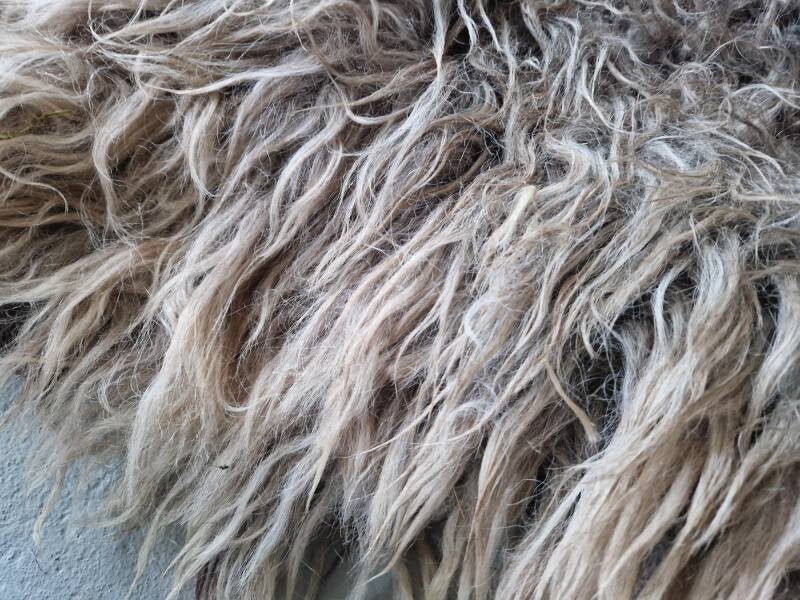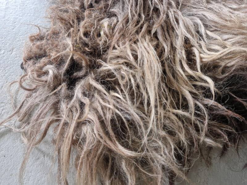 Stevig gevilte vacht met halflange tot lange lokken in bruin, taupe, grijs en camel. Typisch Schoonebeeker, dus een beetje stoere lokken. Het rugstuk is iets korter, zoals vaak het geval is.