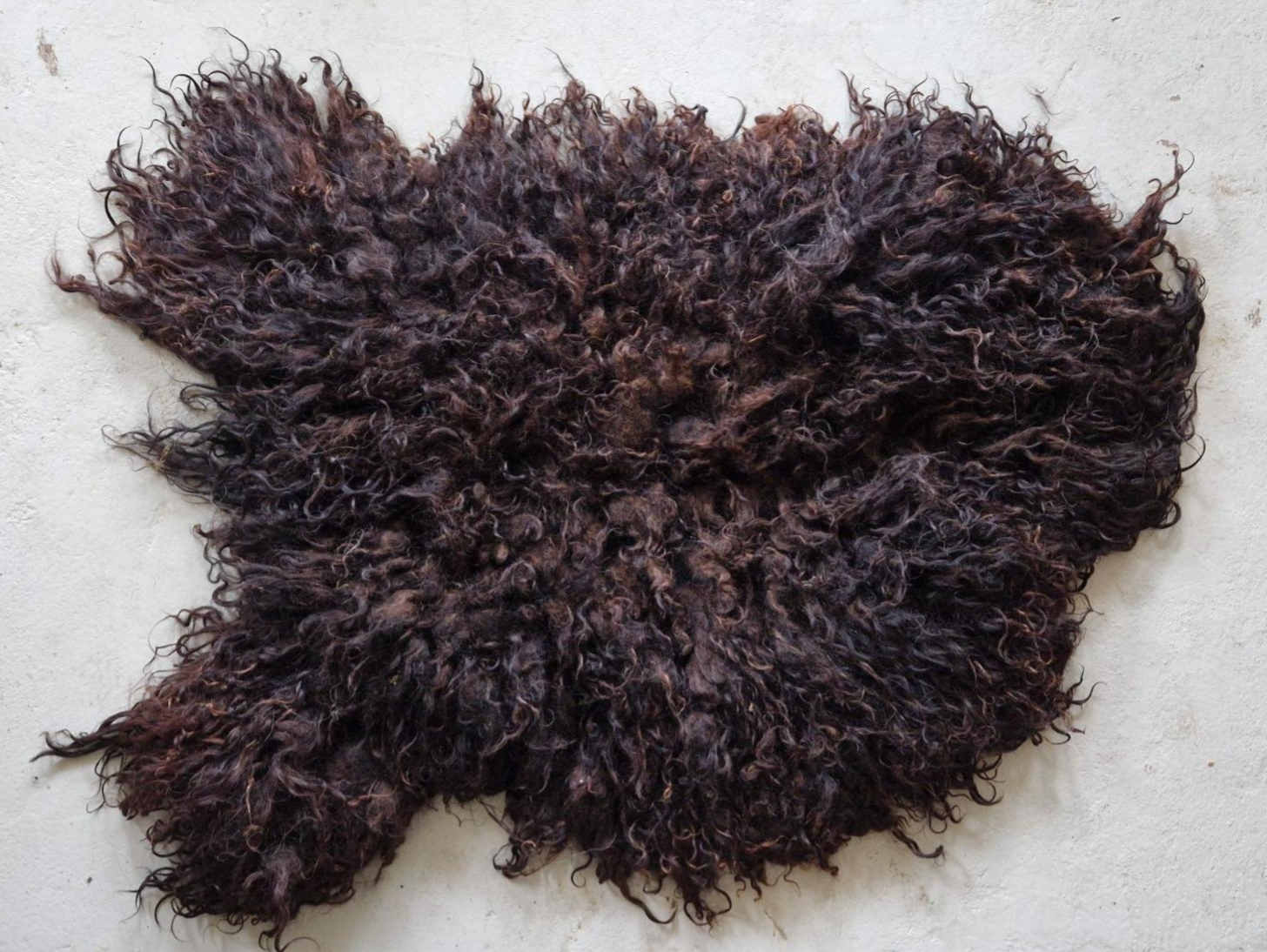 Erg donkere vacht. Zwarte, licht glanzende lokken (behalve op het rugstuk), maar door de zon zijn enkele lokken opgelicht naar bruin, vooral op het rugstuk. Daar zitten ook wat natuurlijk vervilte lokken, te zien op de foto waarop de vacht op een stoeltje ligt. De vervilte stukjes lichten bruin op.