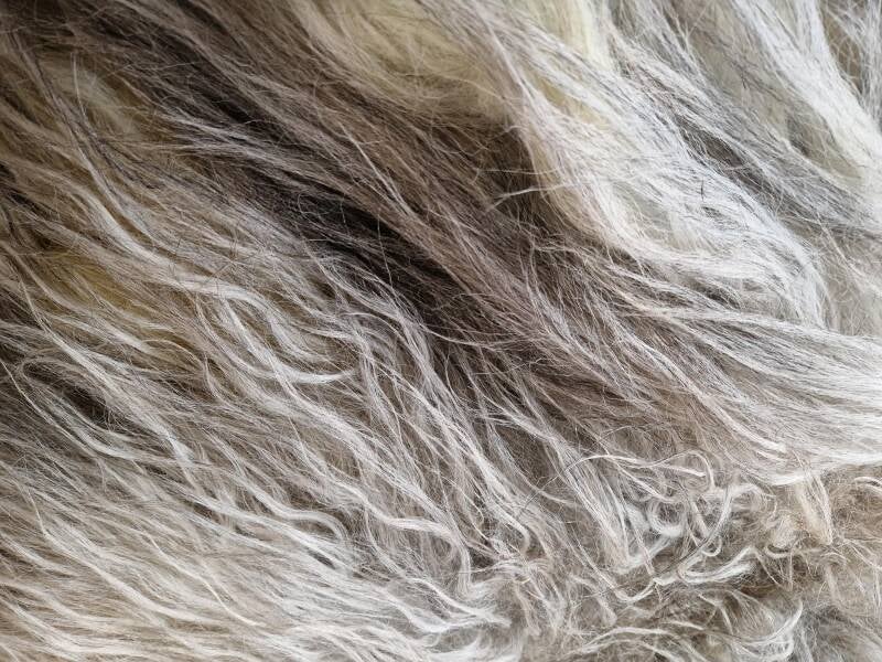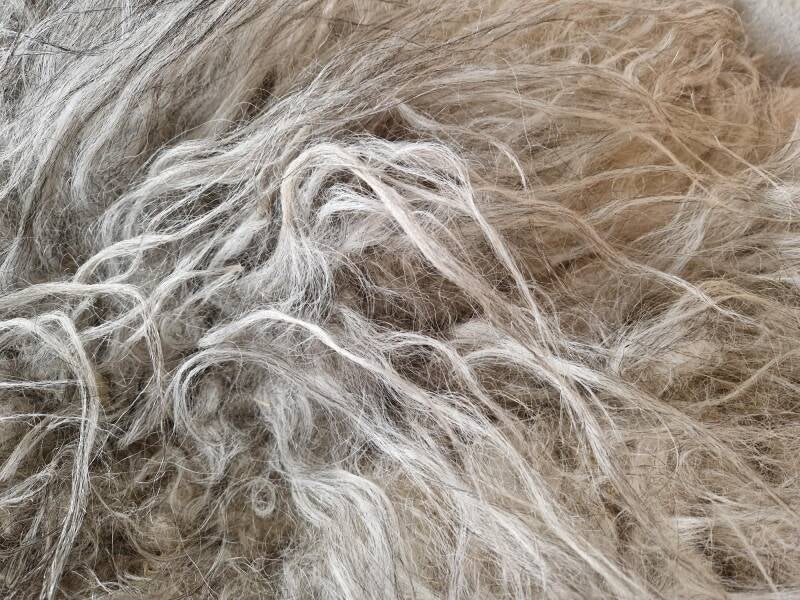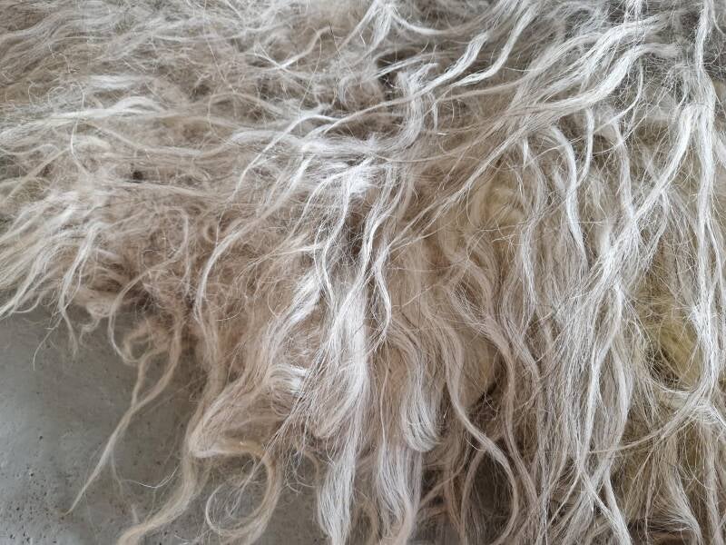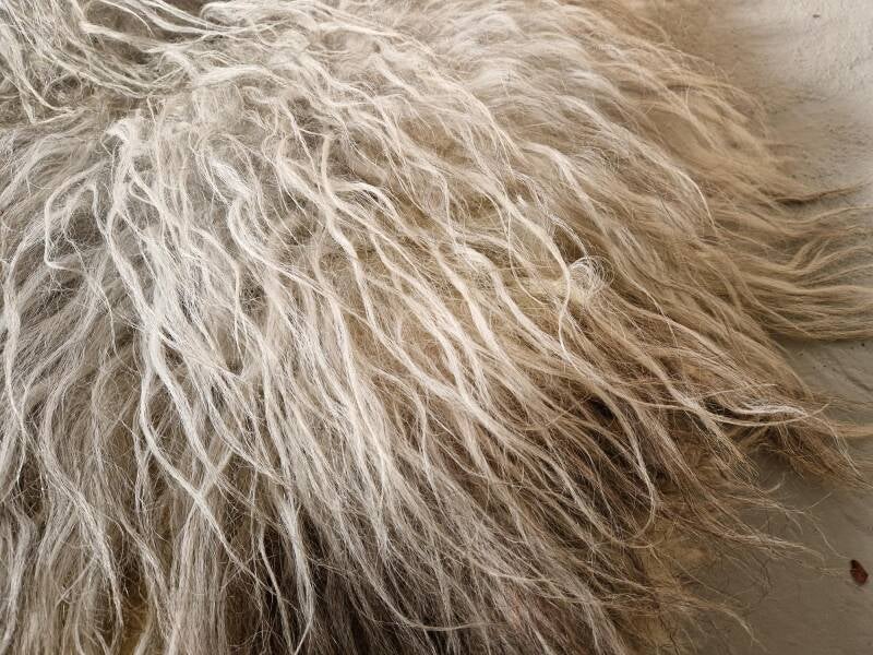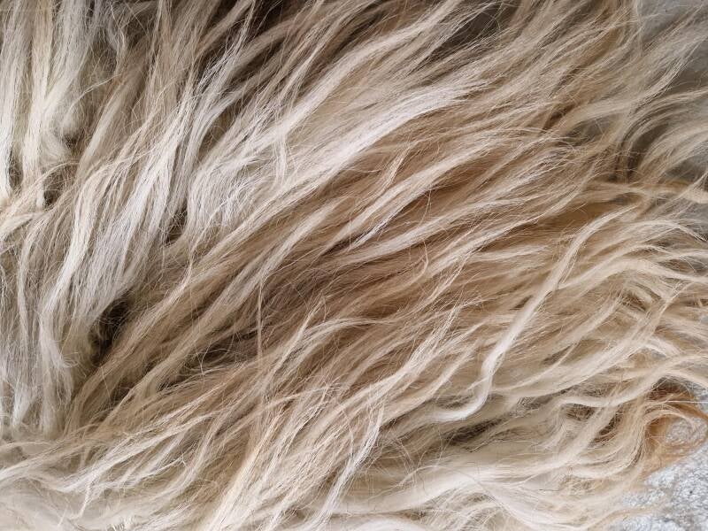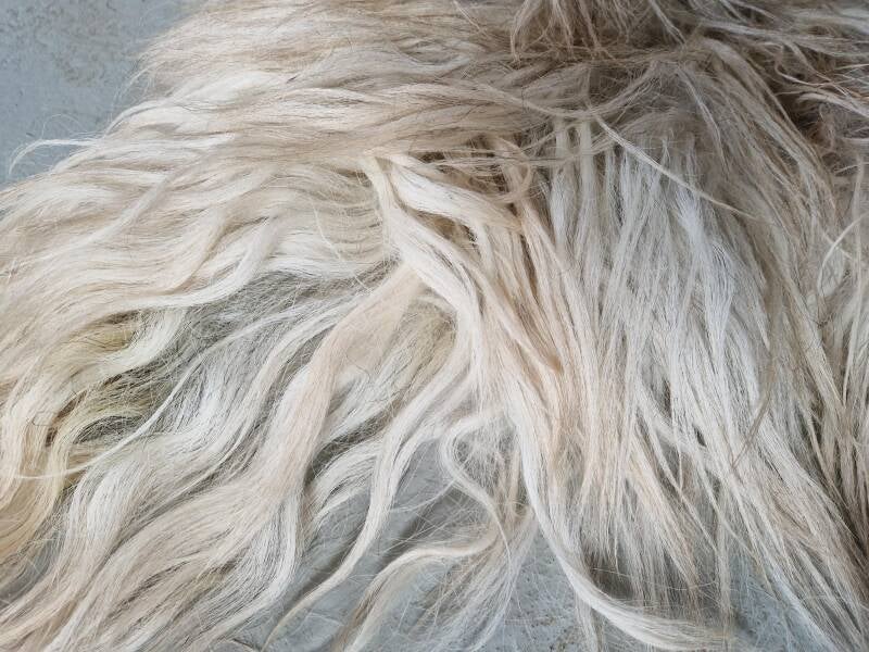 Lange lokken in wolwit, grijswit, vossig wit en enkele donkergrijze. Een blauwvos tekening. De lokken zijn bij de voorpoten in de basis wat geel, zie foto met mijn hand waarop ik het laat zien. Werkelijk een prachtig gekleurde vacht. Soepel gevilt.