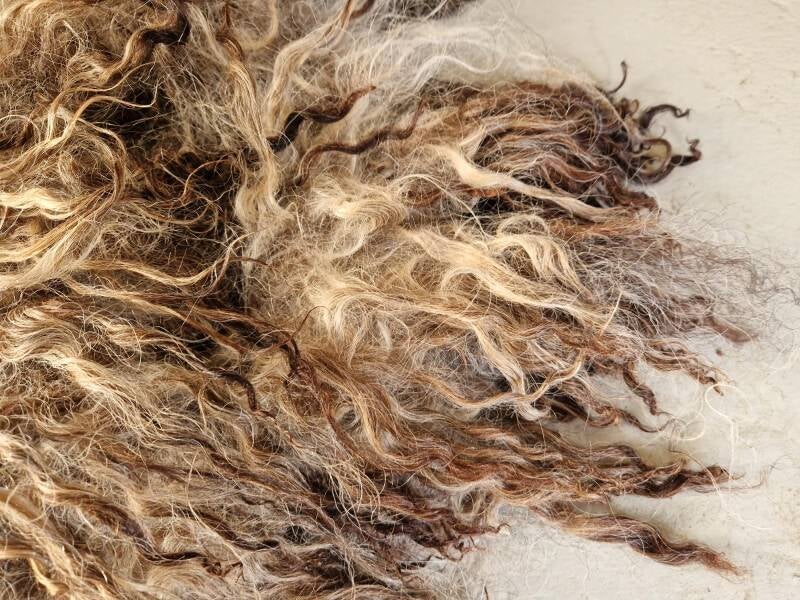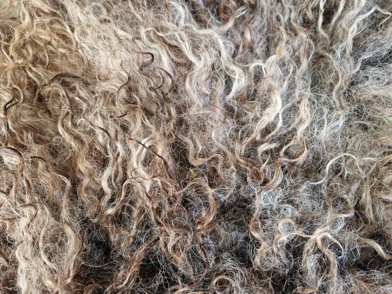 Lekker ruig vachtje met krulletjes. De voorkant bij de nek en schouders is bijna zwart, en loopt verder naar achteren uit in grijs en warm bruin. Prachtig gekleurd.