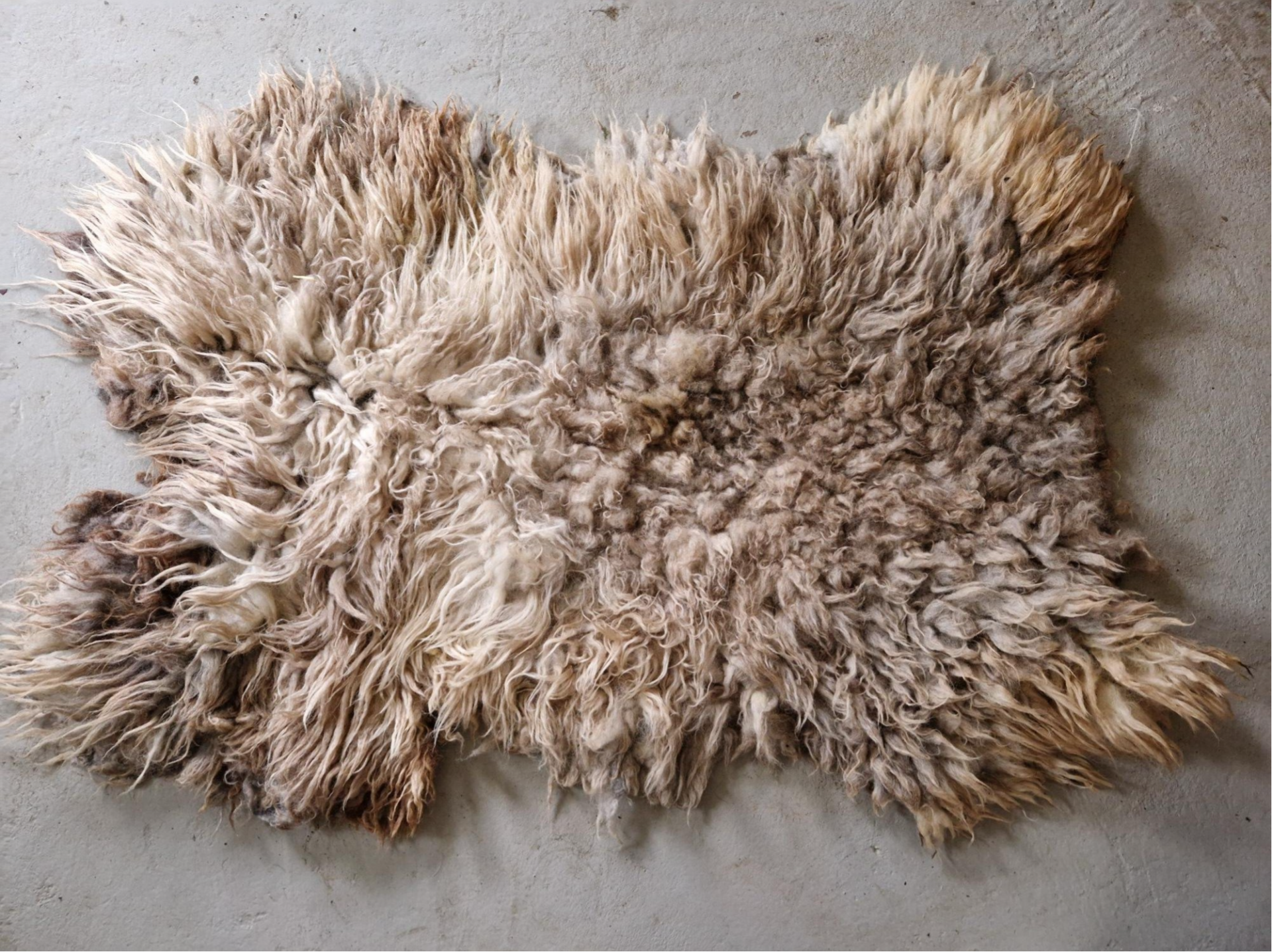 Grote, zachte vacht. Stevig gevilt, kan op de grond of in een stoel of op de bank, comfortabel in gebruik. De kleuren variëren van lichtgrijzig, beige, crème en bruin tot een klein plukje blond. De lokken zijn lang en dik, het rugstuk is kort. Overal heerlijk zacht.
