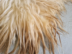 Prachtige lange lokken in wolwit. Bij de achterpoten wat donkerder, dit komt door natuurlijke verkleuring. Er zit een lichte glans over de lokken.