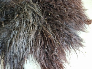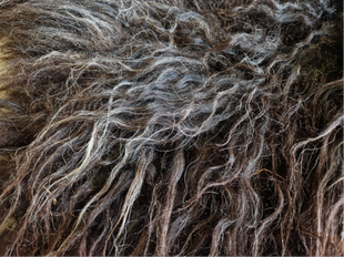 Heel donker vachtje, donkerbruin met antraciet grijs. De lokken zijn vrij lang en zacht. Het punt tussen de schouderbladen is wat rommeliger (de wol was daar erg raar van het schaap af gekomen) en er zitten daar ook nog relatief veel stukjes lokale flora in (foto met mijn hand). Dit is echter niet storend voor de zachtheid.