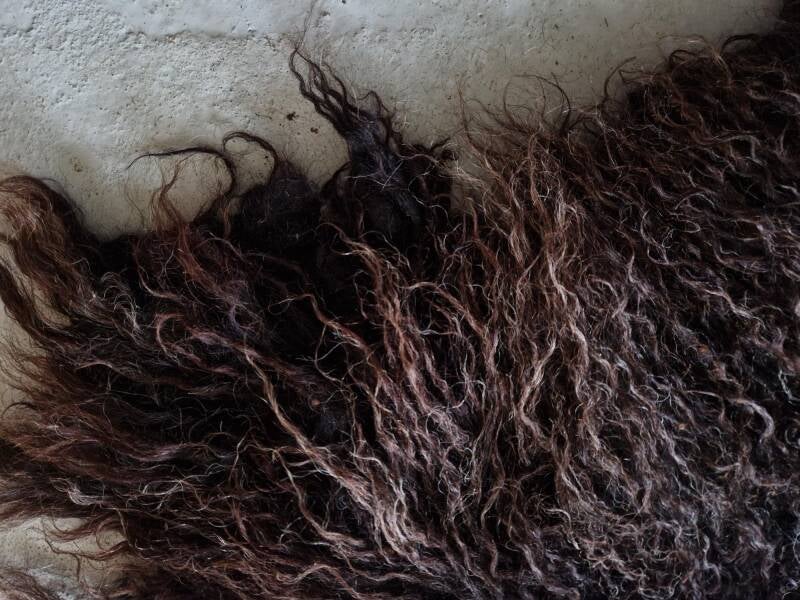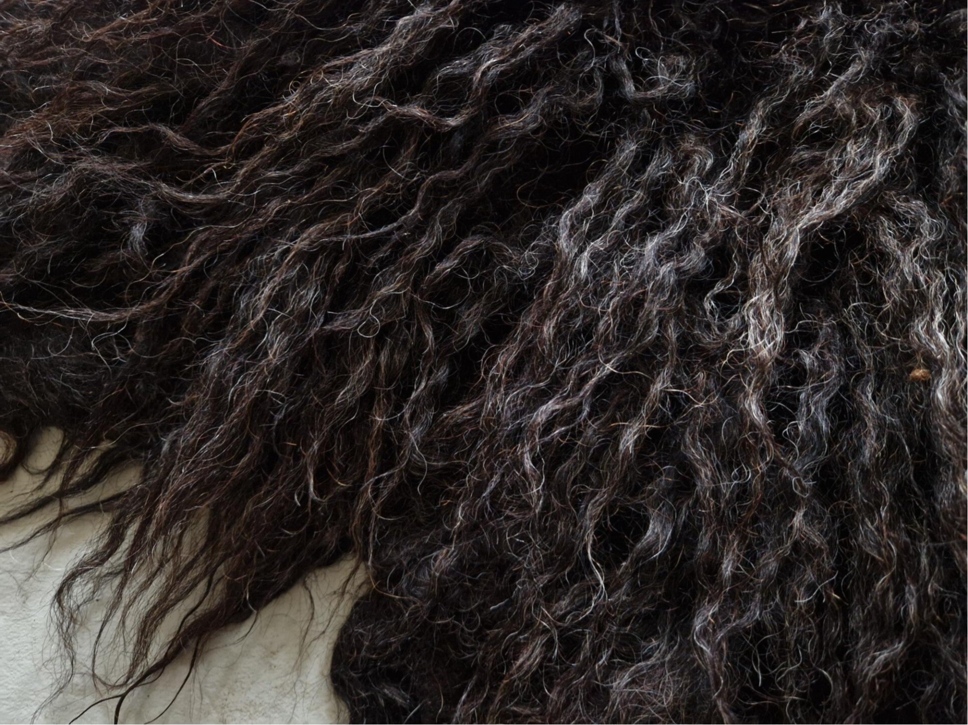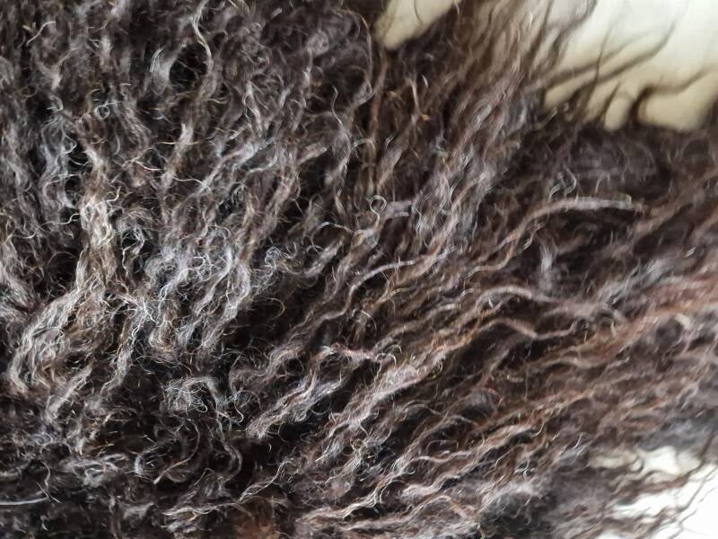 Erg donker vachtje, zwart met donkerbruin. Prachtige krulletjes met een lichte glans. Het nekgedeelte is