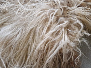 Mooi vol vachtje met lange lokken. Wolwit en voskleurig (cognac, roest) in de nek, te zien op de foto. Het ruggedeelte is wat 'grauwer' van kleur en in de nek zitten nog wat stukjes hei, maar dat is niet storend.