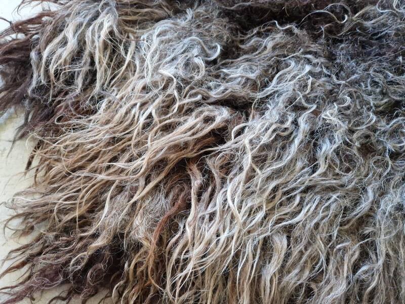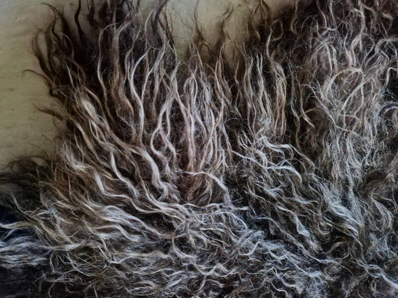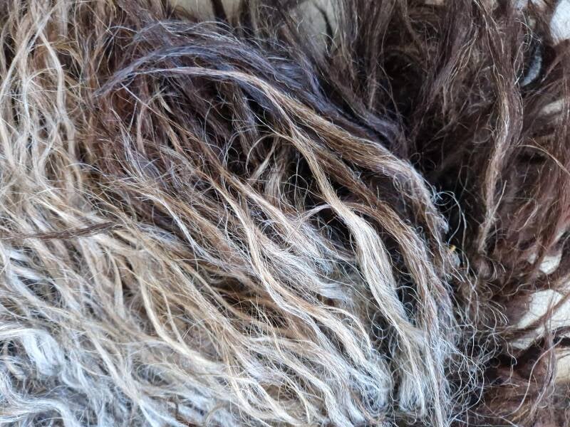 Krullerig vachtje in grijs, bruinig en taupe. Het ruggedeelte en de kop zijn erg donker. In de schaduw lijkt de vacht meer grijzig, in de zon wat warmer van kleur, meer bruin.