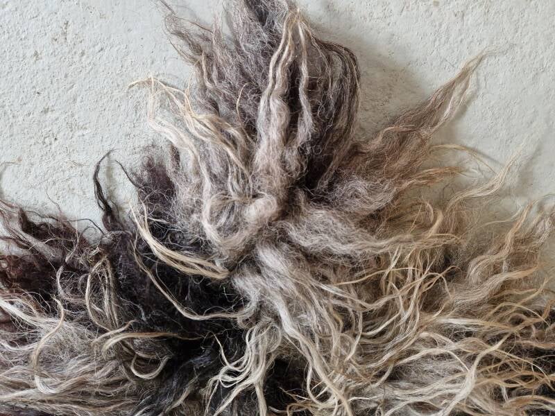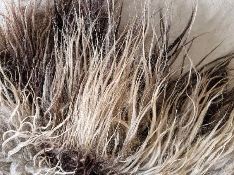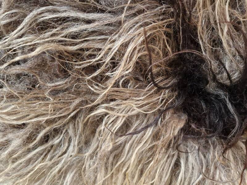 Vachtje in grijs met bruin en zelfs wat zwart. Overall oogt hij grijs. Er zitten her en der wat natuurlijk vervilte stukjes in, maar dit is niet storend. Stevig gevilt. Mooi en fijn voor in een stoeltje. De vacht lag ontzettend uit elkaar en had hele slechte stukken. Deze heb ik verwijderd en de rest mooi aan elkaar gemaakt, met behoud van het natuurlijke kleurenpatroon.