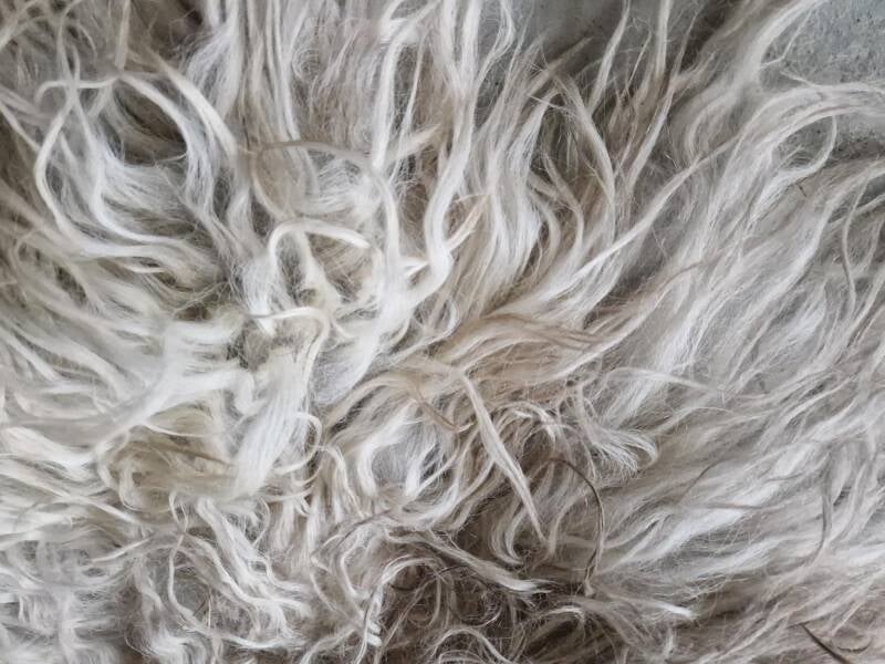 Beetje ijswitte vacht. Komt door de grijze ondertoon die diverse lokken hebben. De lokken zijn mooi lang en heel licht glanzend. Valt mooi.