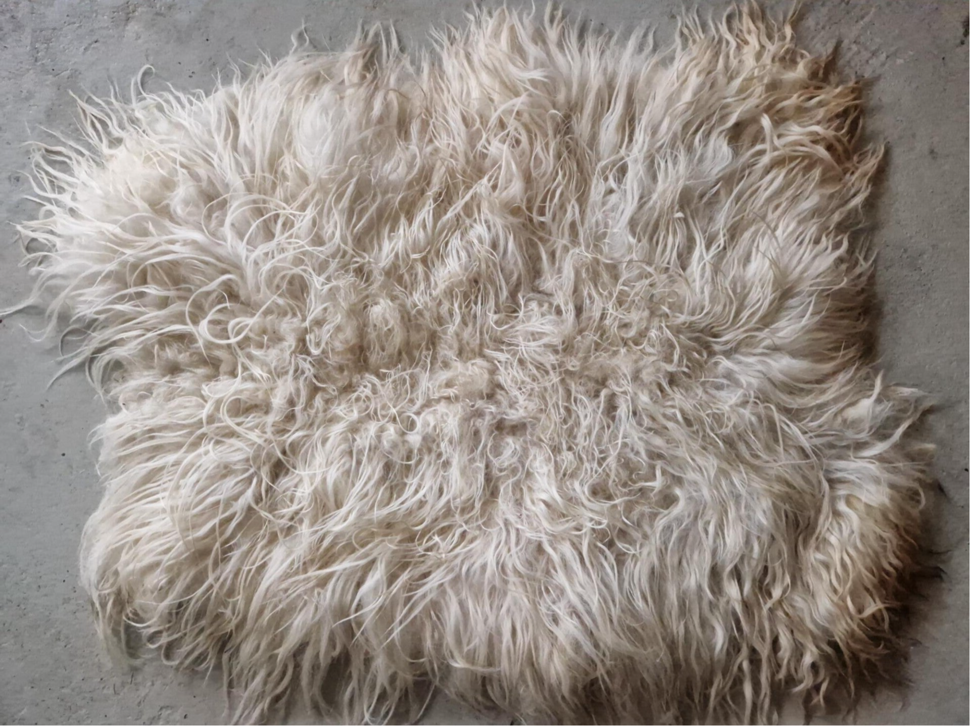Prachtige wolwitte lokken met een lichte glans. Vrij grote vacht, van een ram.