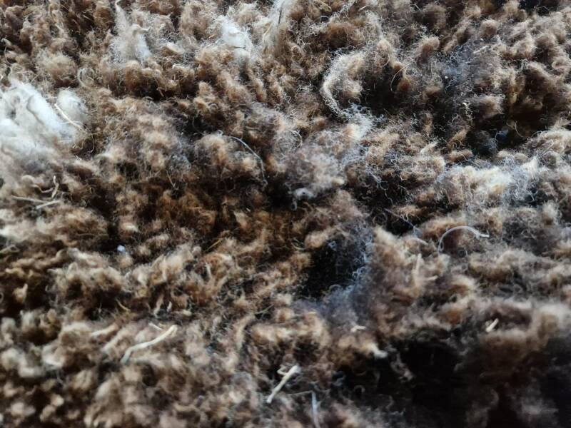Grote, stevig gevilte en zware vacht. Een vloerkleed bijna. Mooie bruine korte lokken, her en der wat witte lokken. Sommige plekken iets 'pluiziger', daar komt de basis van de lokken wat naar boven.