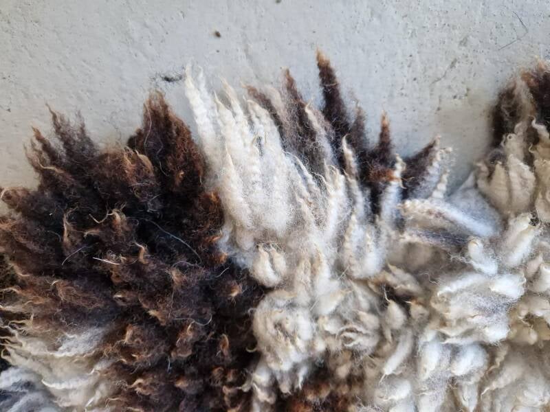 De wol komt van een Nederlands Bont Schaap uit Gelderland, waar ze woont in een hobbykoppel. Op de laatste foto ligt deze vacht op de bank. Op de grond ligt vacht #746.