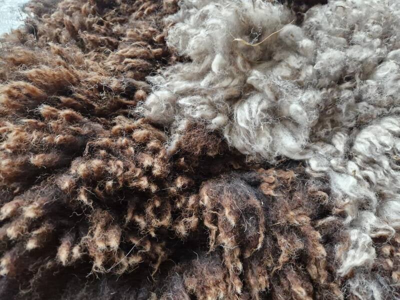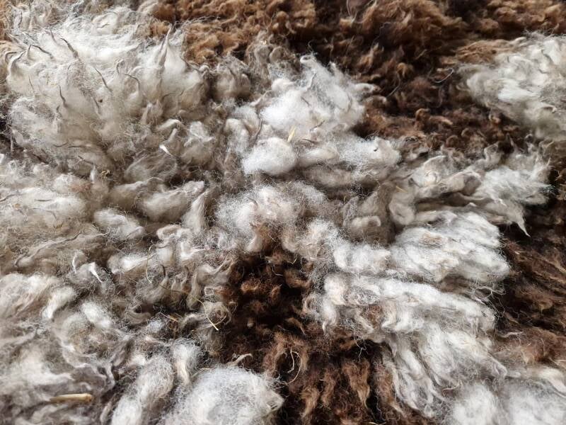 De wol varieert erg in lengte, van heel kort tot kort, waar door de vacht wat 'rommelig' en erg natuurlijk oogt (je kunt op het schaap zelf als het verschil in lengte van de wol zien, zeker het verschil tussen de bruine en witte wol). Wit tot grijzig en grauwig wit (zeker wat in de punten, zie foto's), en bruin. Erg zacht. Vrij soepel gevilt. Er zitten nog wat hooitjes in de vacht.
