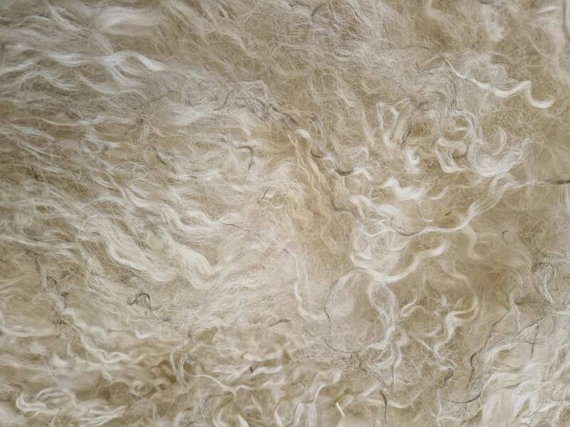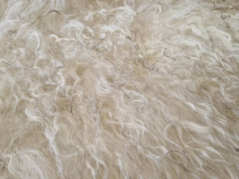 Krullende vacht, redelijk wit van kleur voor wol. De lokken zijn her en der glanzend, behalve op het stuk tussen de schouderbladen, daar is de wol wat ruwer. Op het rugstuk zijn sommige lokken ietwat grauwig opgedroogd, die foto's. De vacht is gewassen en heeft een nacht in de wolshampoo geweekt.