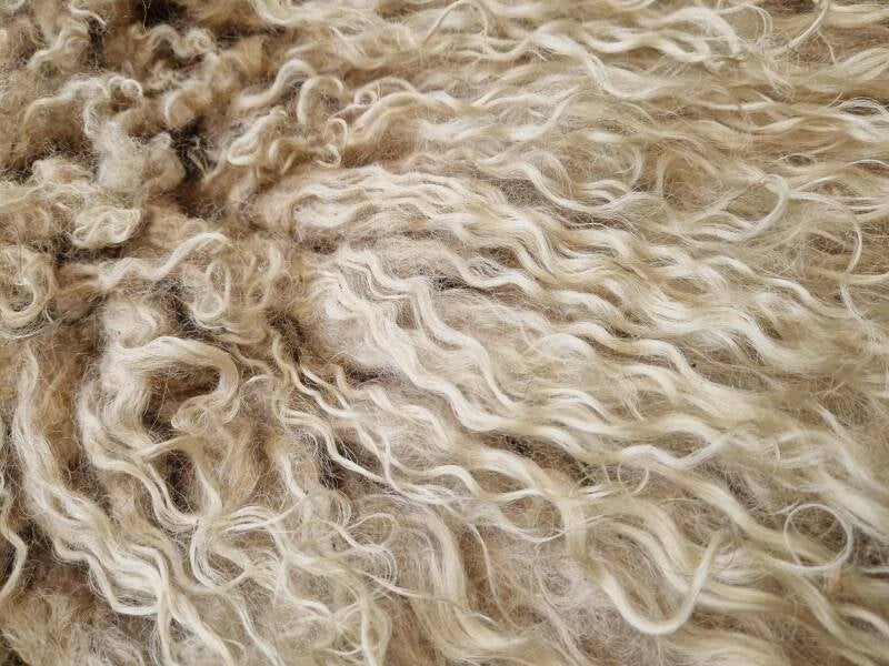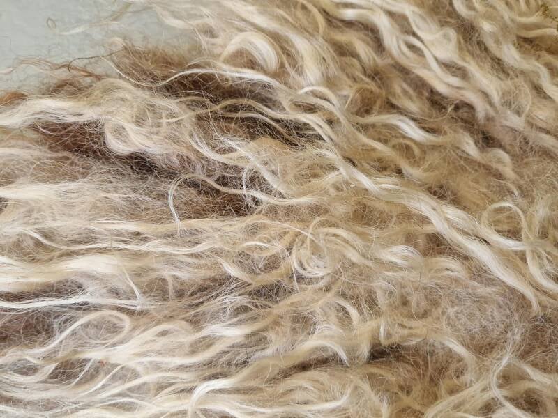 Stevige vacht die al wat vervilt was, waardoor sommige lokken wat in elkaar vervilt zijn in de basis (zie foto's). Ondanks dat de wol is lekker zacht is, heeft de vacht hierdoor niet zo'n glans zoals de andere vachten van dit ras (vandaar ook de aangepaste prijs). De vacht is wat blond, goudblond van kleur (absoluut niet wit), door de bruinige basis in alle lokken. Heel mooi warm van kleur (de kleur is vooral goed te zien op de overzichtsfoto, de foto waarop de vacht in zijn geheel staat). Heel fijne vacht om echt te gebruiken in bijvoorbeeld een stoel of op de bank.