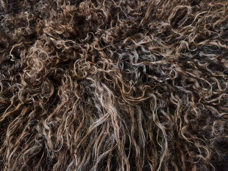 Prachtige donkere, glanzende, heel lange lokken met krul. Zwart schaap waarvan de wol door de zon is verkleurt naar donkerbruin en her en der een tikje taupe/grijs. De gemeten 120 cm is zonder die hele lange uitlopers.