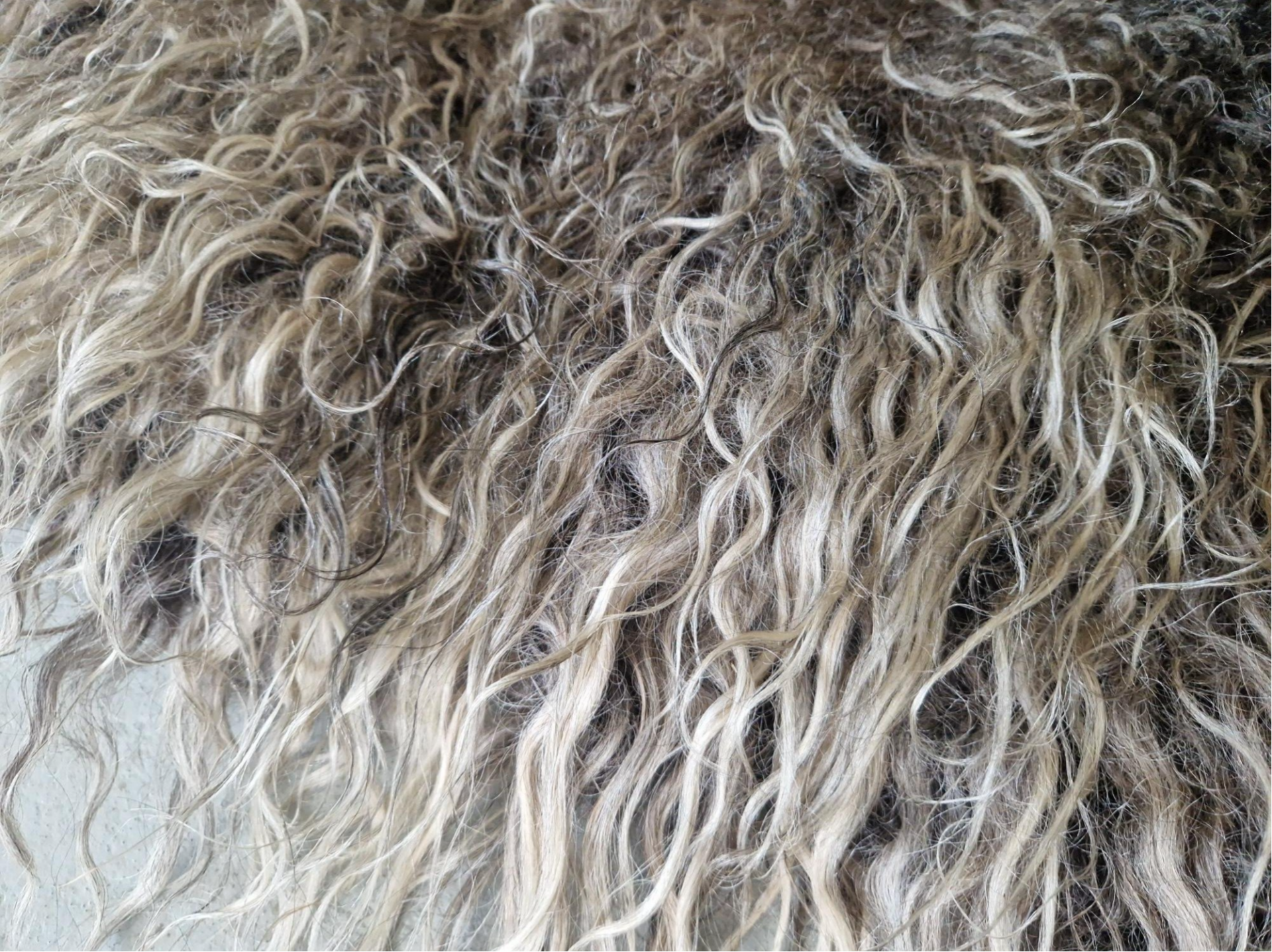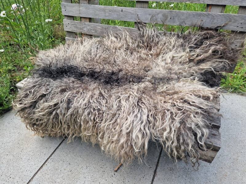 Prachtige, licht glanzende, lange lokken met lichte krul. Taupe, beige, zwart, grijs.. Stevig gevilt en een dikke, zware vacht. Heel mooi voor op de grond.