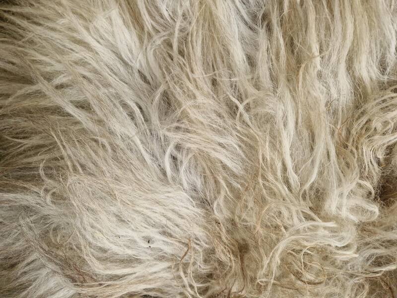 Mooie, fijne lange lokken in wolwit, ijs/grijswit, grijzig en een paar lokken bruinig. Zacht en fluffy, dik. Op het nekstuk en tussen de schouderbladen zitten nog wat hooitjes (zie foto met mijn hand) maar dit is niet storend.