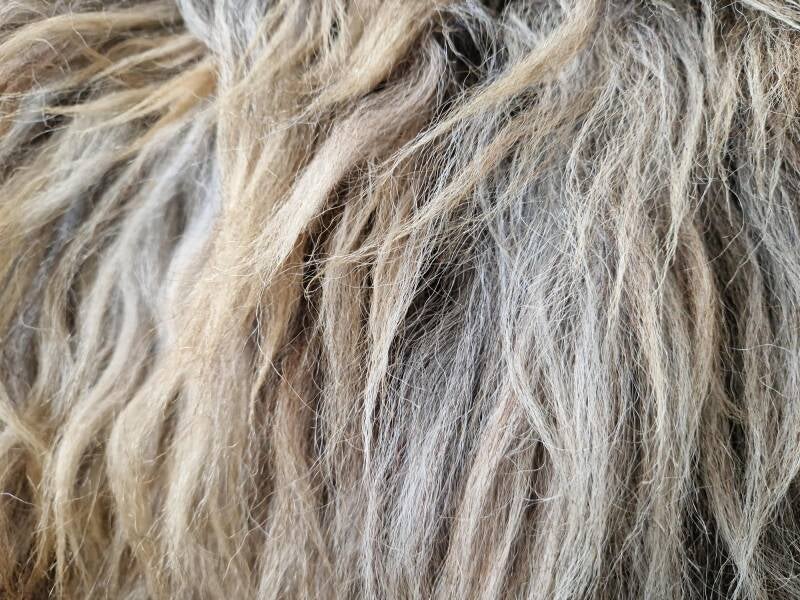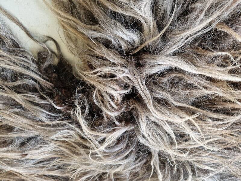 Dikke vacht met dikke, lange lokken. Prachtige kleurmelange. Stevig gevilt.