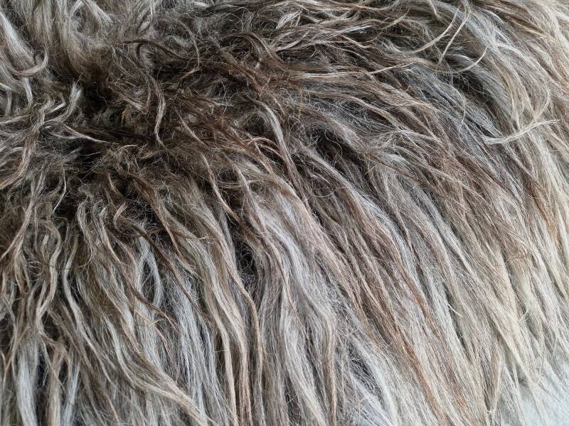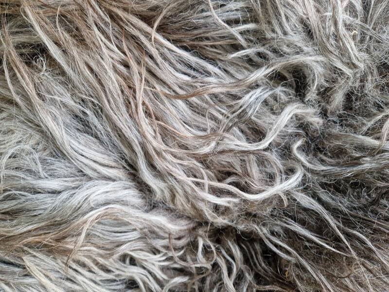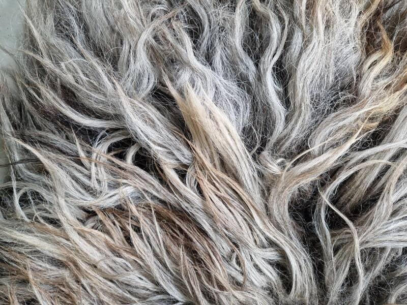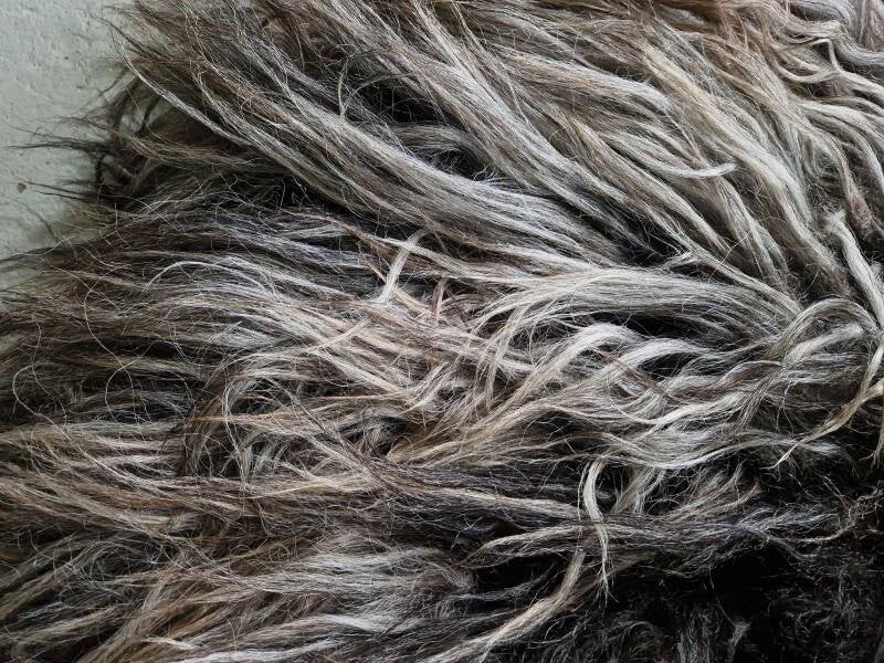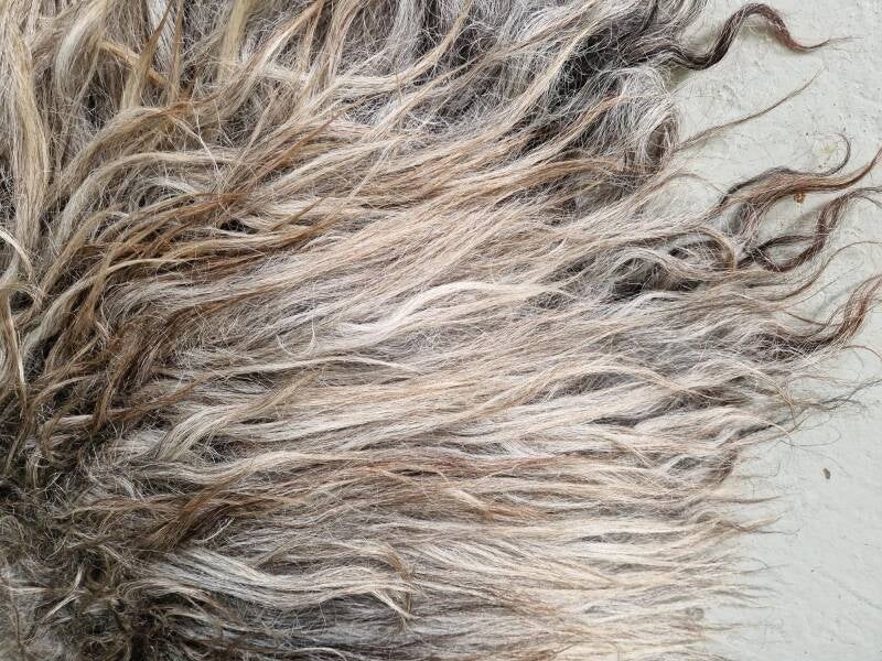 Dikke vacht met dikke, lange lokken. Prachtige kleurmelange. Stevig gevilt.