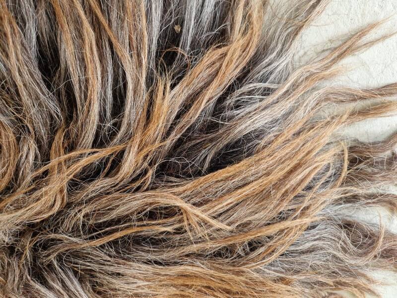Lange, goudbruine lokken. De basis is donker, her en der een tikje grijs.