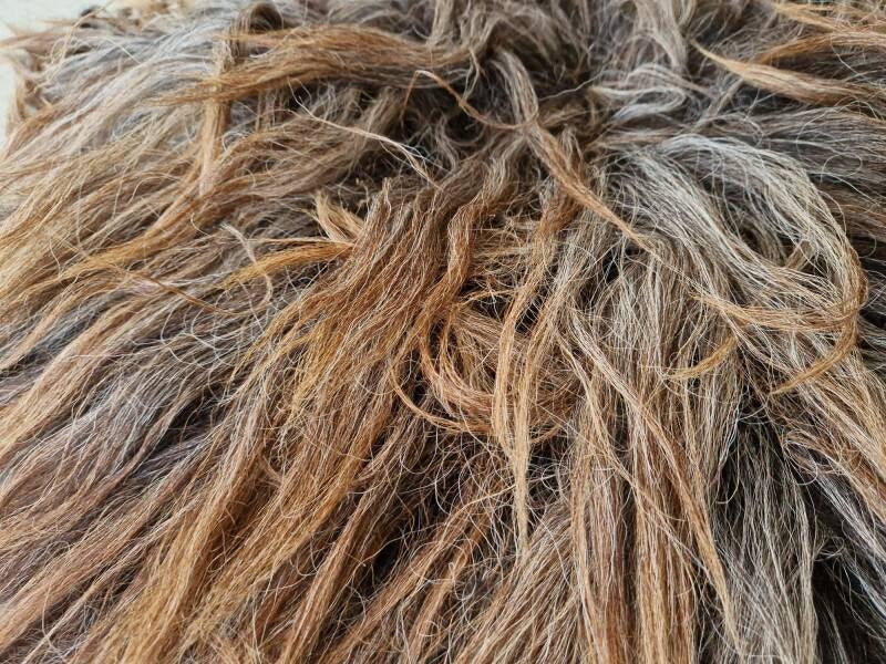 Lange, bruine lokken met een donkere basis, her en der een tikje grijs.