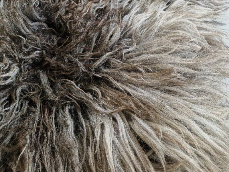Grijs-taupe kleurige, volle vacht met lange lokken. De voorkant, bij de nek en voorpoten, donkergrijs, en naar de achterkant toe langzaam meer bruinig/taupe/lichter grijs. Prachtige kleurmêlange. De lokken zijn wat ruwig/niet glad.