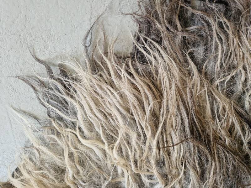 Wat ruigere, lange lokken in taupe, bruin en grijs. Grijs in de basis, de lokken zijn grijs en beetje beige achtig. Zeker in het zonlicht kleurt de vacht warm van kleur (foto op het bankje).