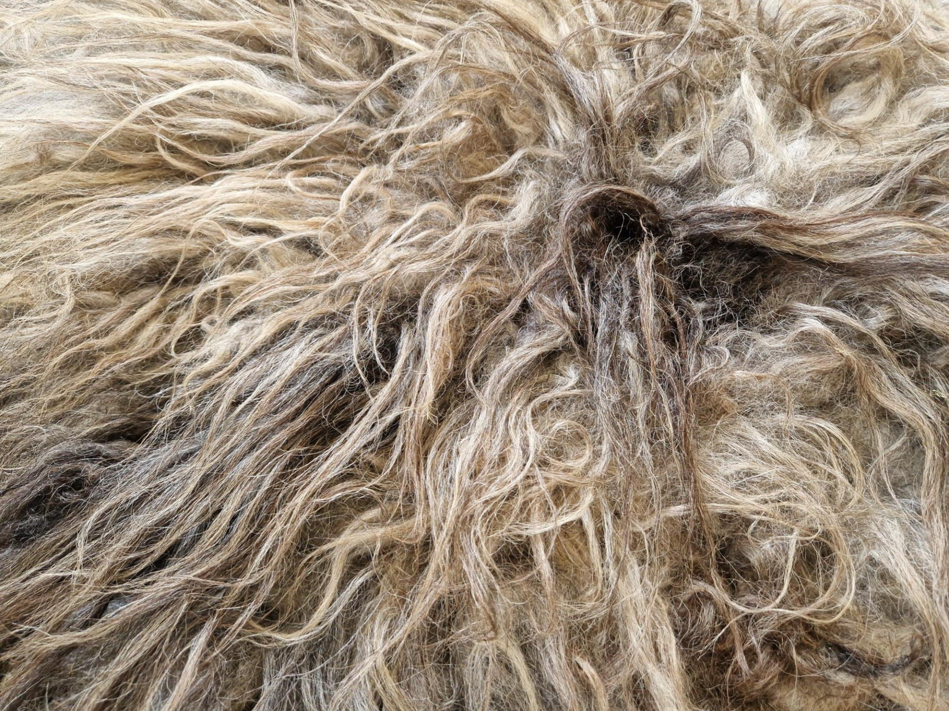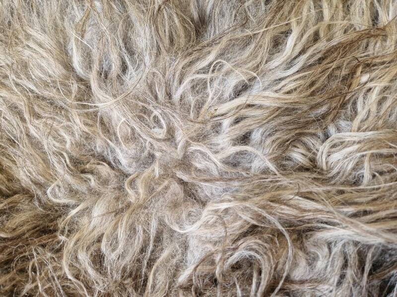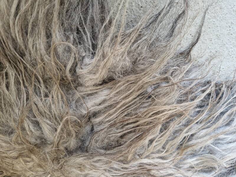 Ruigere vacht (lokken zijn niet glad) in grijs en taupe. Bij de schouders is de wol duidelijk donkerder.