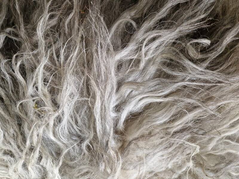 Heel lange lokken in warmwit, koeler wit en grijs. Er zitten nog wat stukjes lokale flora in het nekstuk, maar dit is totaal niet storend. Op het bankje is het de linker vacht. (De rechter vacht is #810.)