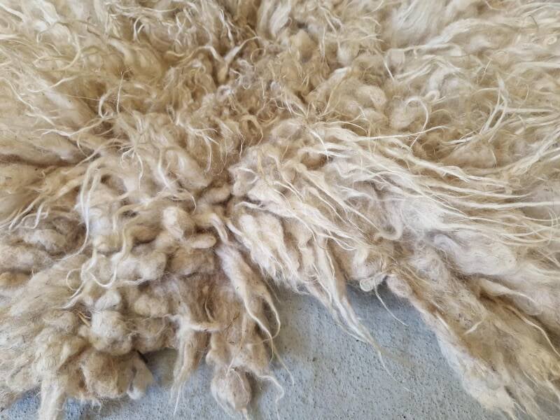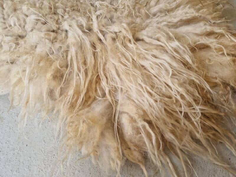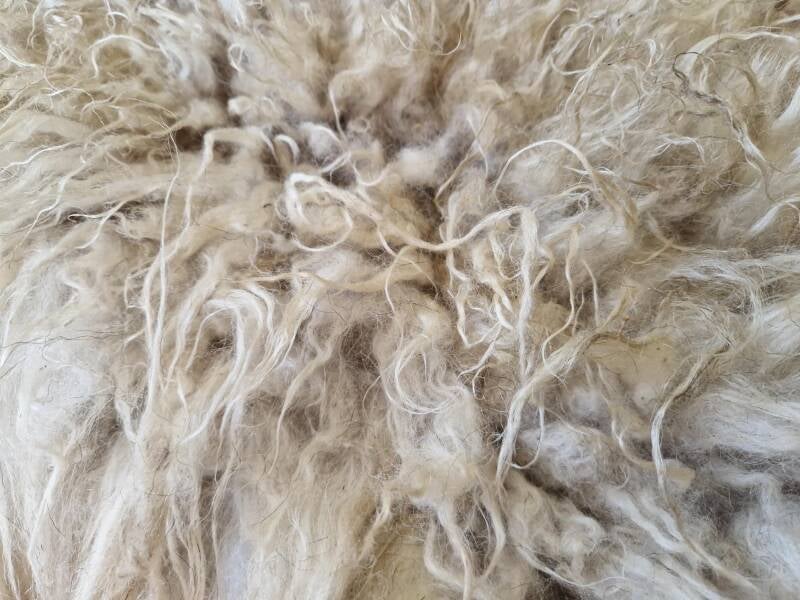 Heerlijk zacht, beetje rommelig ogend vachtje van lamswol. Eerste keer dat het schaap geschoren is. Typische structuur daarvan: zacht, lichte krul, beetje grauwig wit.