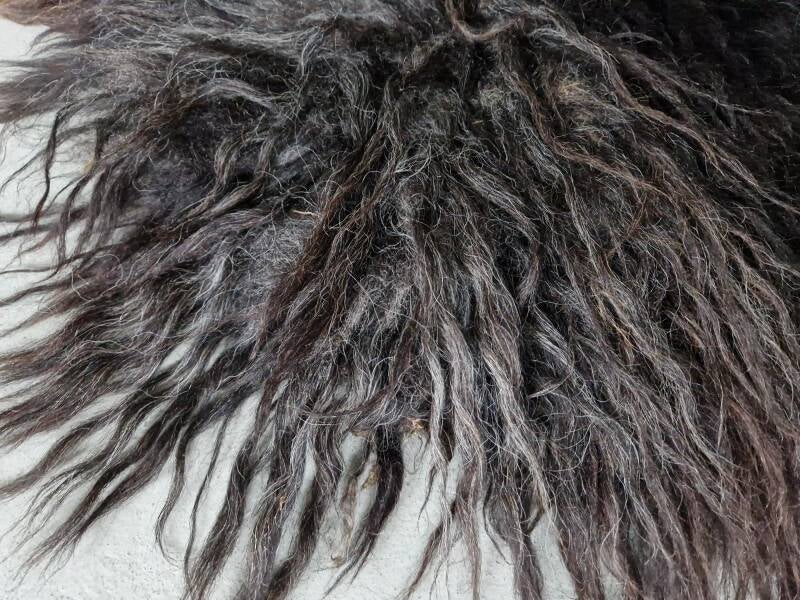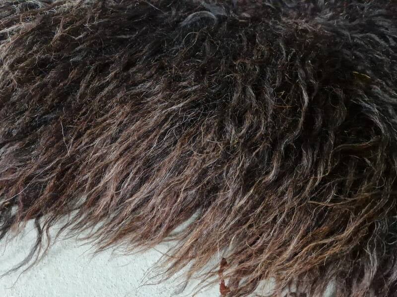 Dikke, lange lokken in zwart, donkerbruin (in de punten) en in de nek anthraciet grijs.