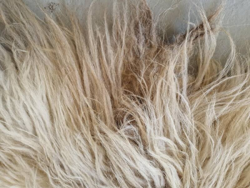 Vrij ruwe lokken, halflang in warm wolwit en een tikje grijzige haren (zie foto's) her en der in de ondertoon bij de achterpoten. Typische Schoonebeeker wol, voelt iets stugger aan. Heel warm van kleur. Tíkje beige in de nek (zie foto, twee plukjes).