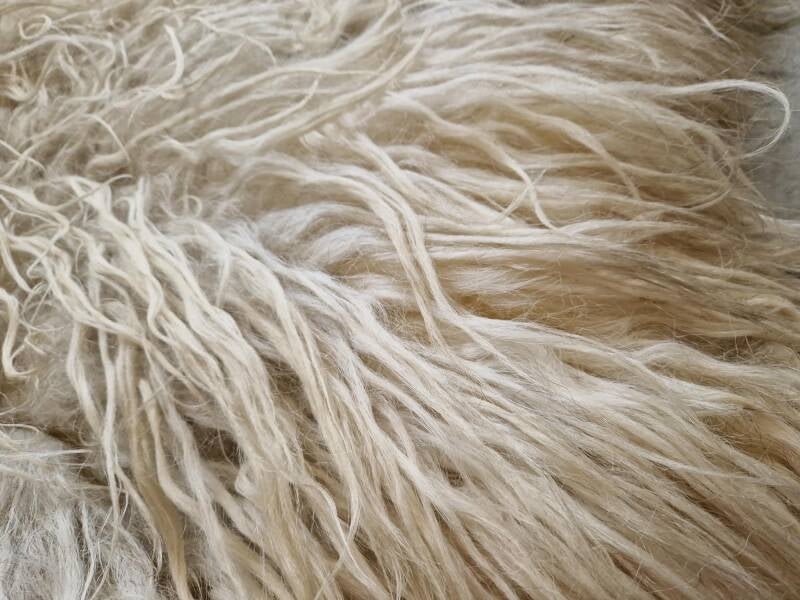 Grote, dikke maar toch soepele vacht. Lokken in wit met ook duidelijk grijze haren ertussen (waardoor die stukken meer ijswit zijn, door het grijs wordt het koeler van kleur) en warmer wit vooral bij de poten. Blauwvos heet deze kleurschakering.
