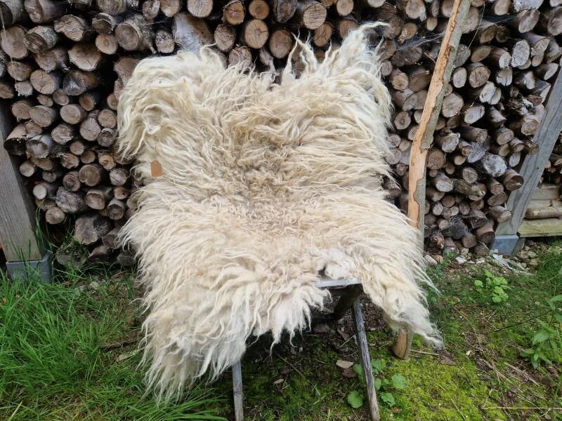 Zacht lamsvachtje van een eerste schering. Typisch lamswol: beetje rommelig, zacht, lichte krul, grauwig wit met wat grijs en vossigs erdoor. Er zitten nog wat stukjes lokale flora in de vacht, zie foto met mijn hand. De wol komt van een Drents Heideschaap ui Brabant, waar hij graast in een natuurgebied. Op de foto staan ze klaar om geschoren te worden, jonge rammen van ruim een jaar oud.