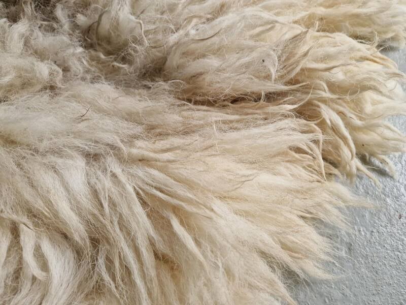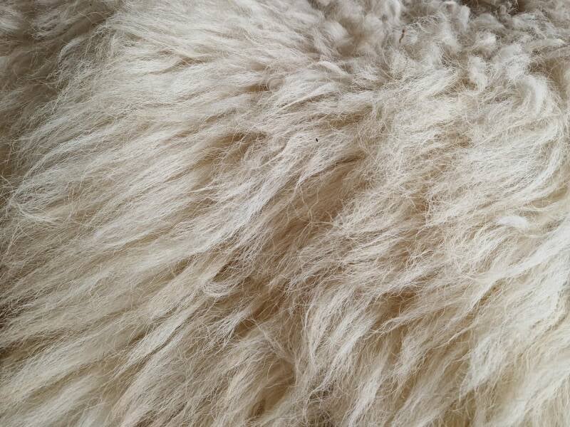 Dikke, grove vacht. De lokken zijn ruwig, niet glad en hebben de typische Schoonebeeker-look: stoer, dik, ietwat 'gelig' wolwit en ietwat grauwig op het rugstuk.