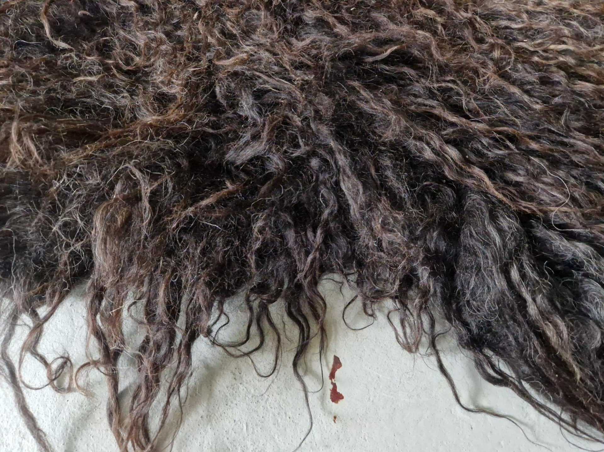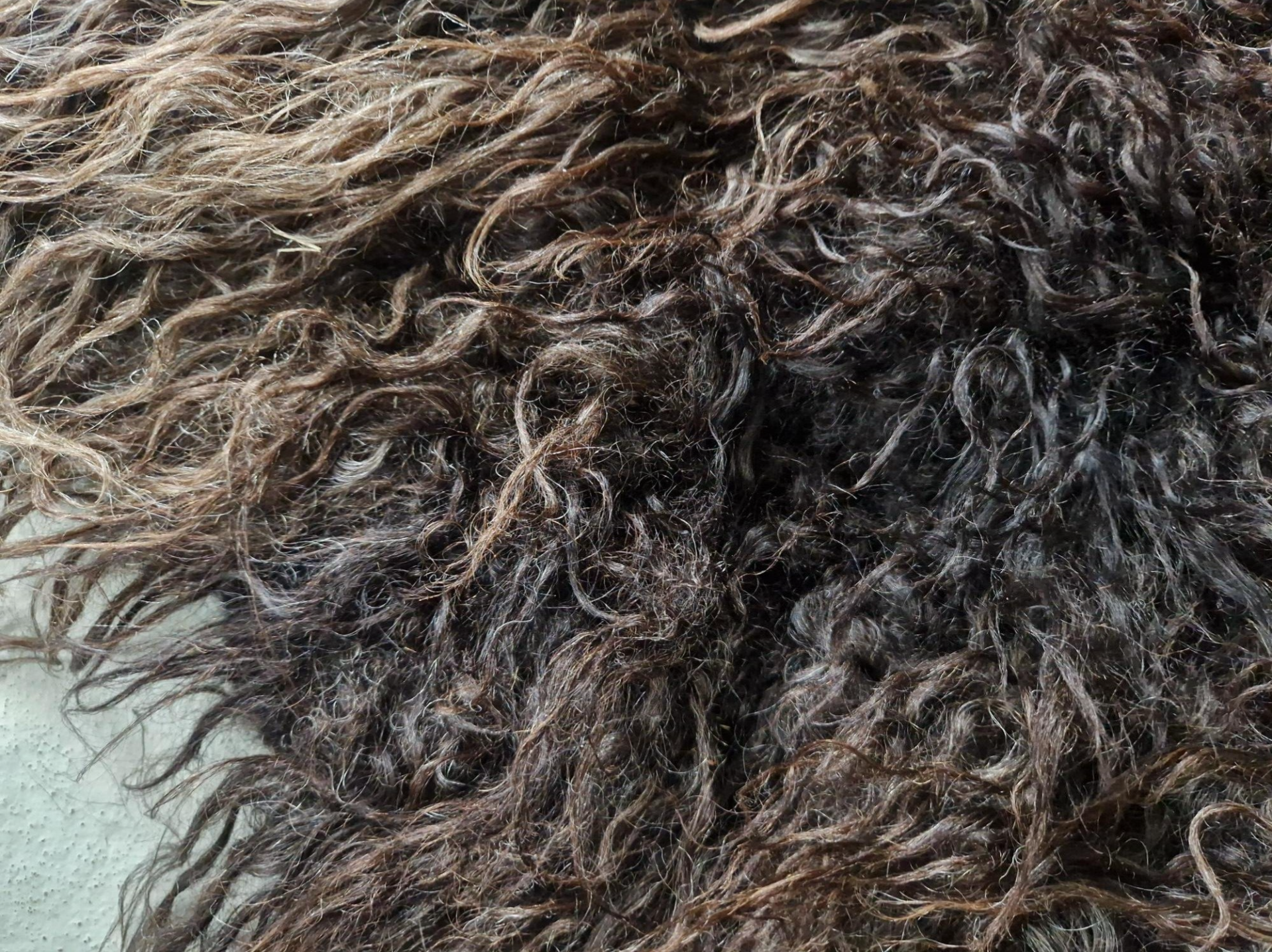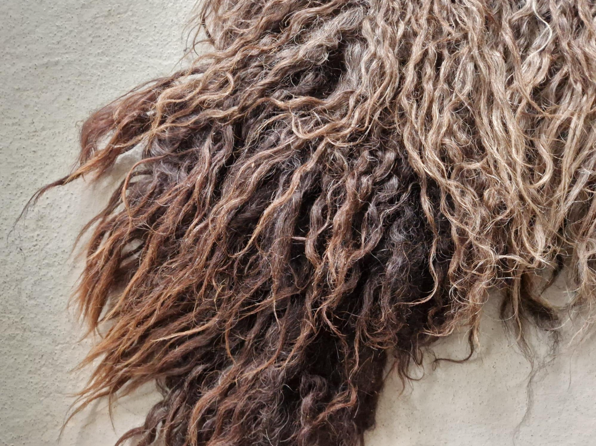 Zwart, donkerbruin en grijs, prachtige donkere nuances. Lange lokken, krul, glans.