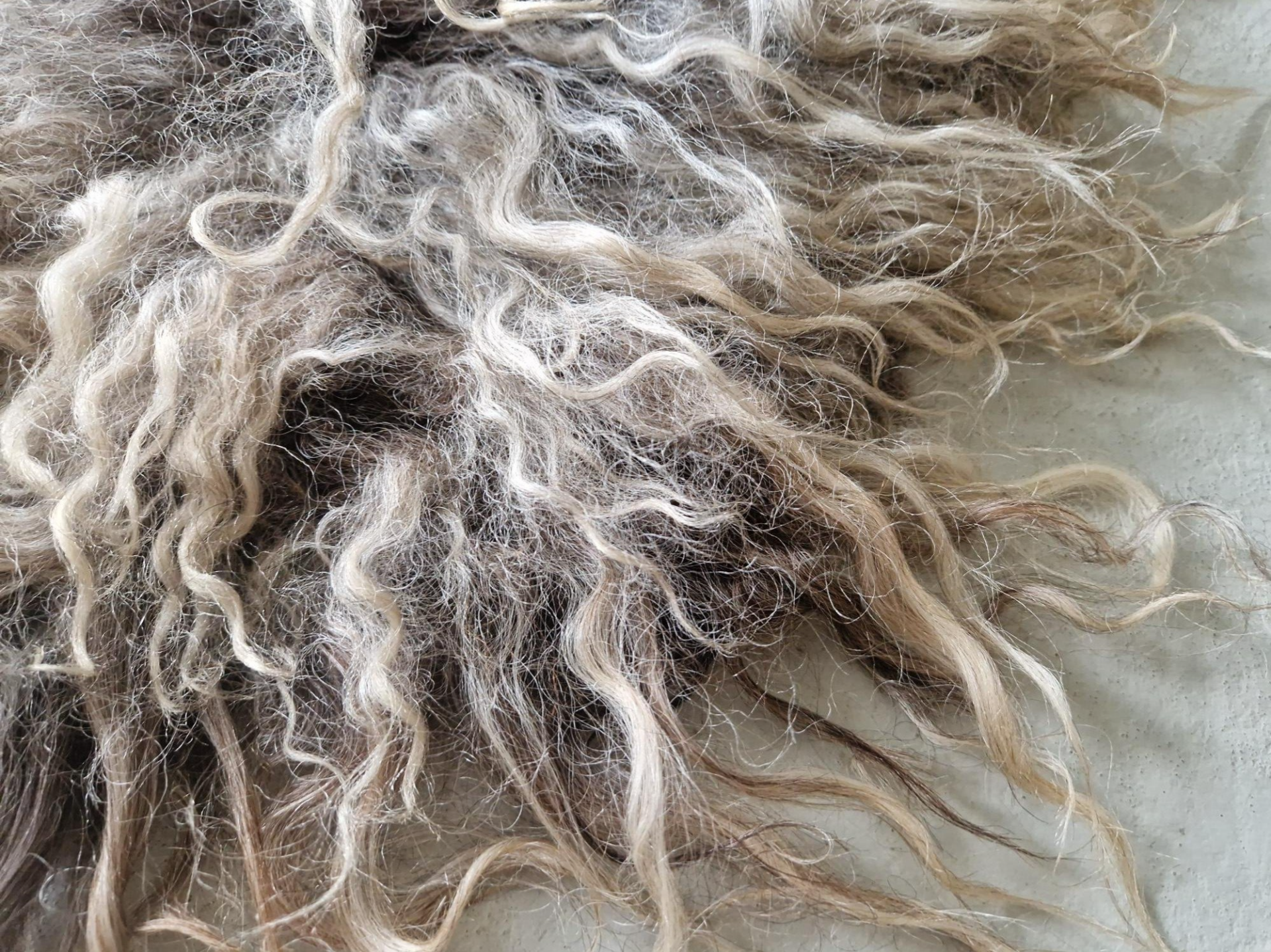 Lange lokken met lichte krul, prachtig gemêleerd in zwart, bruin en grijs, lokken uitlopend naar blond.