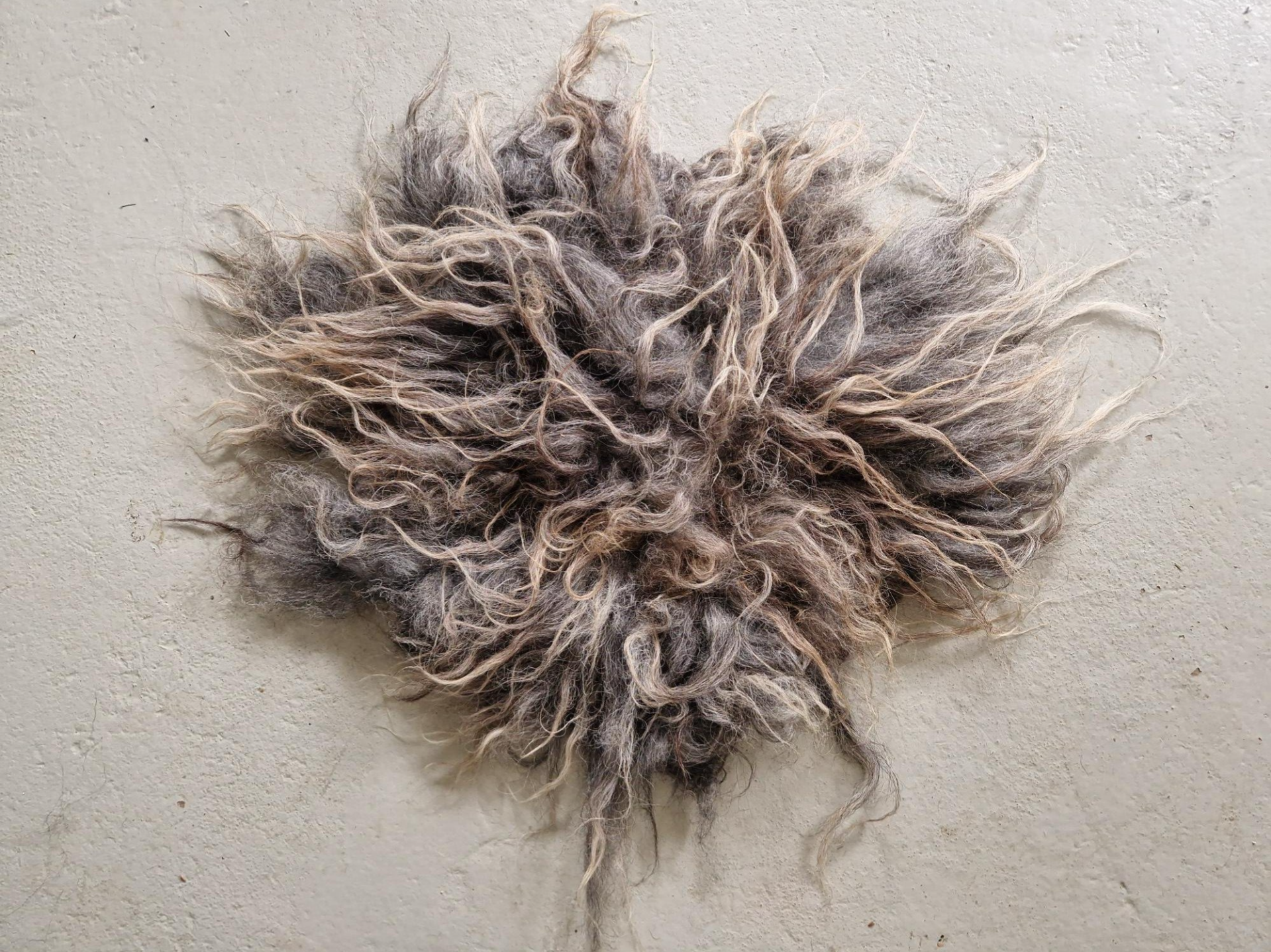 Wat ruwig, stoer uitziend vachtje. De lokken zijn niet glad. Grijs in de basis en naar bruin/beige uitlopend naar de punten toe.