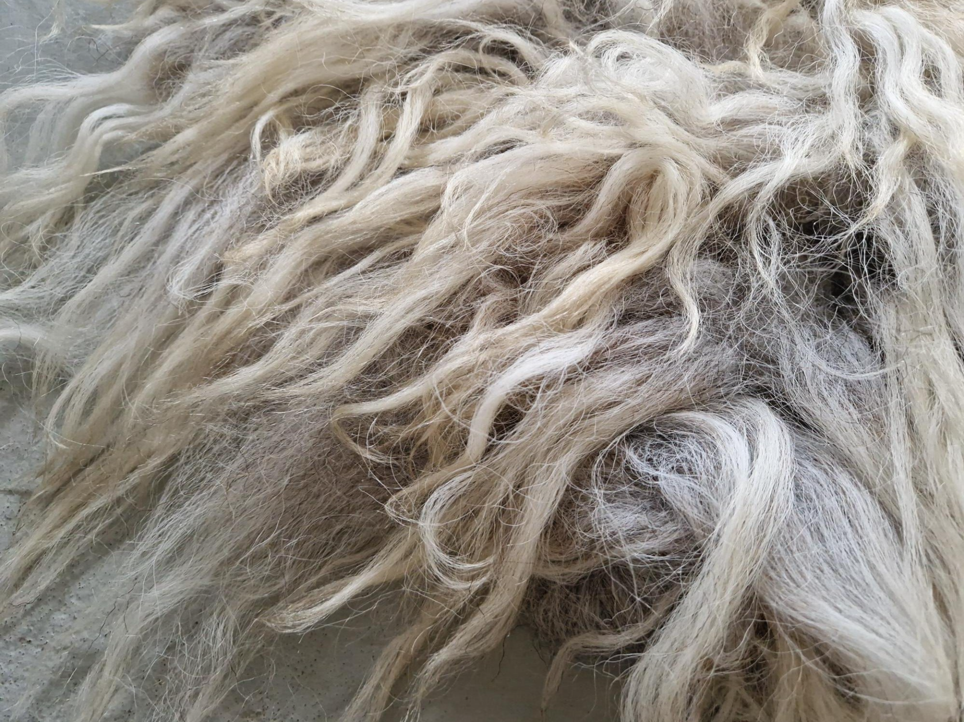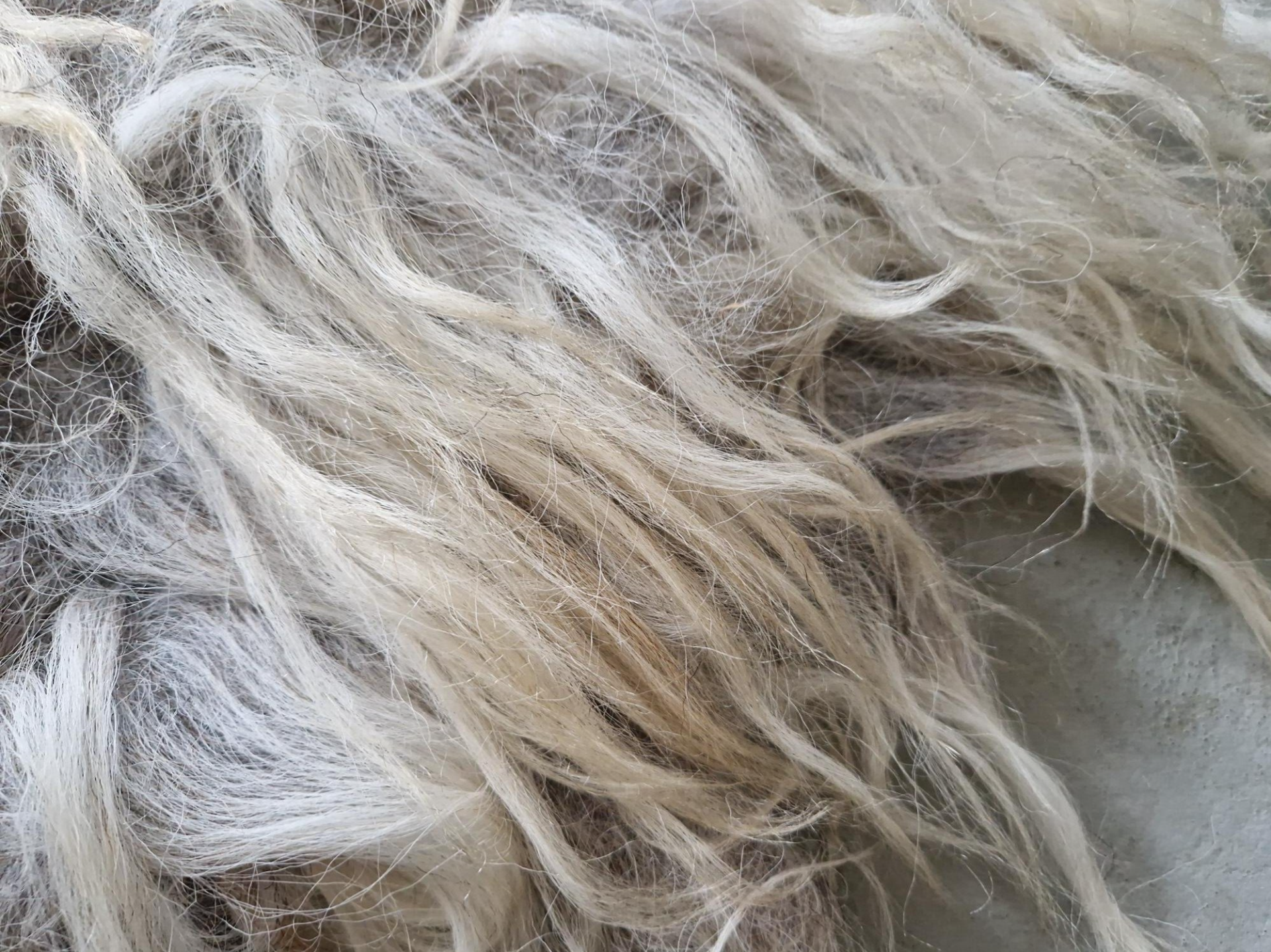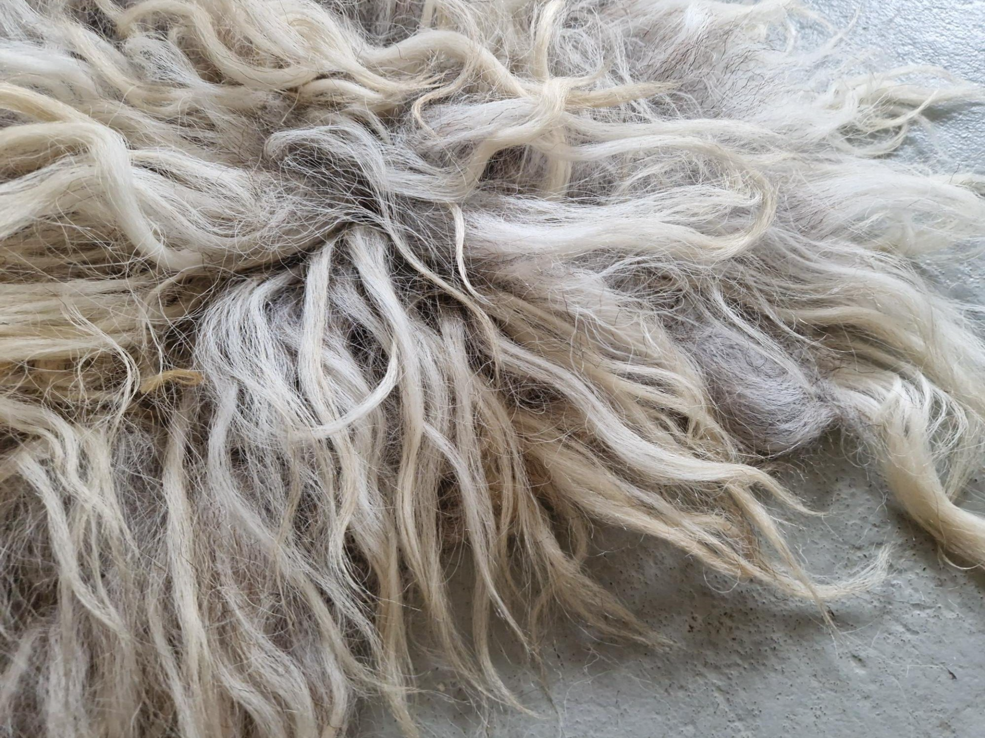 Lange, dikkere lokken. Grijs in de basis, de lokken lopen uit naar licht- en goudblond.