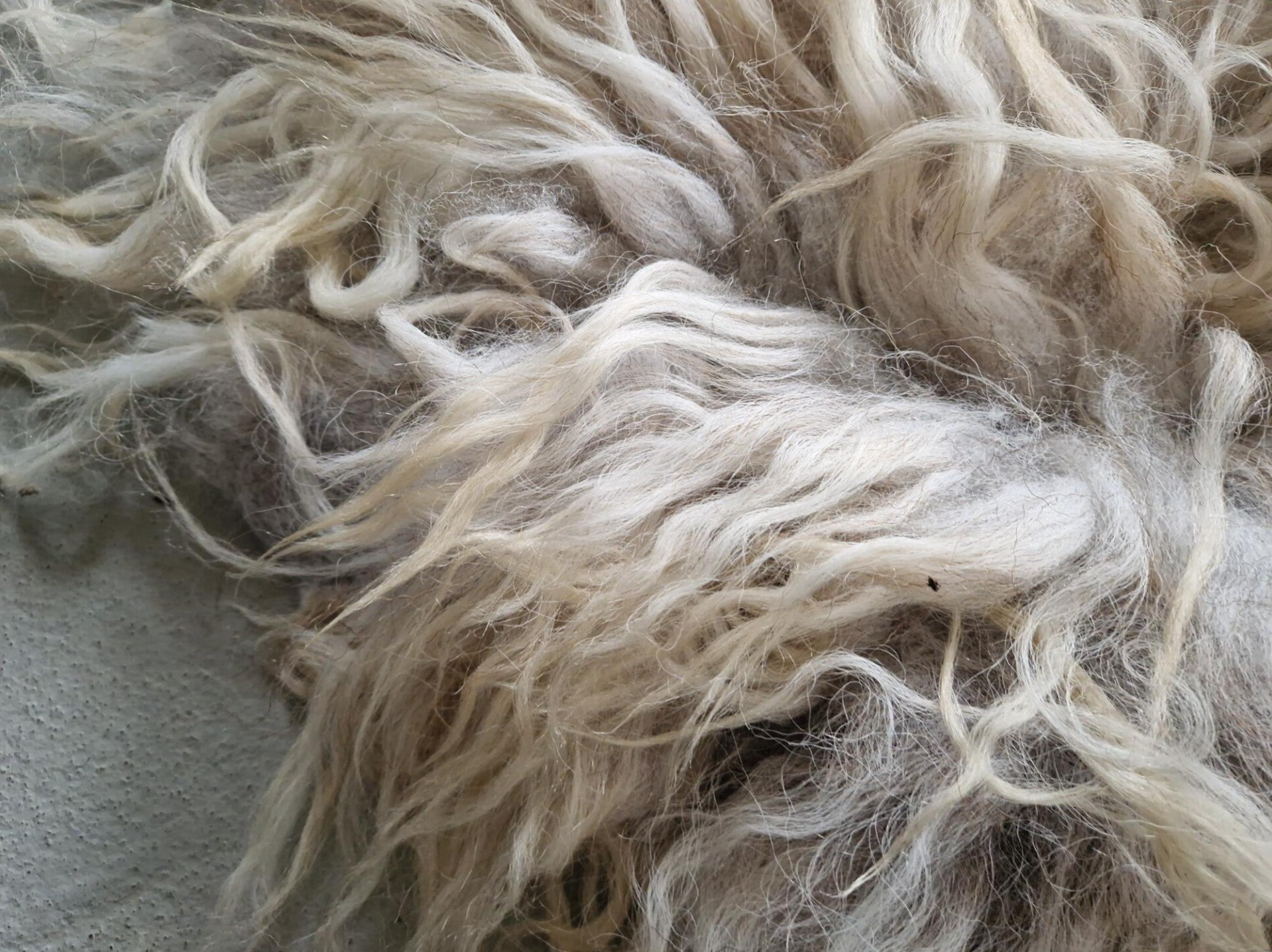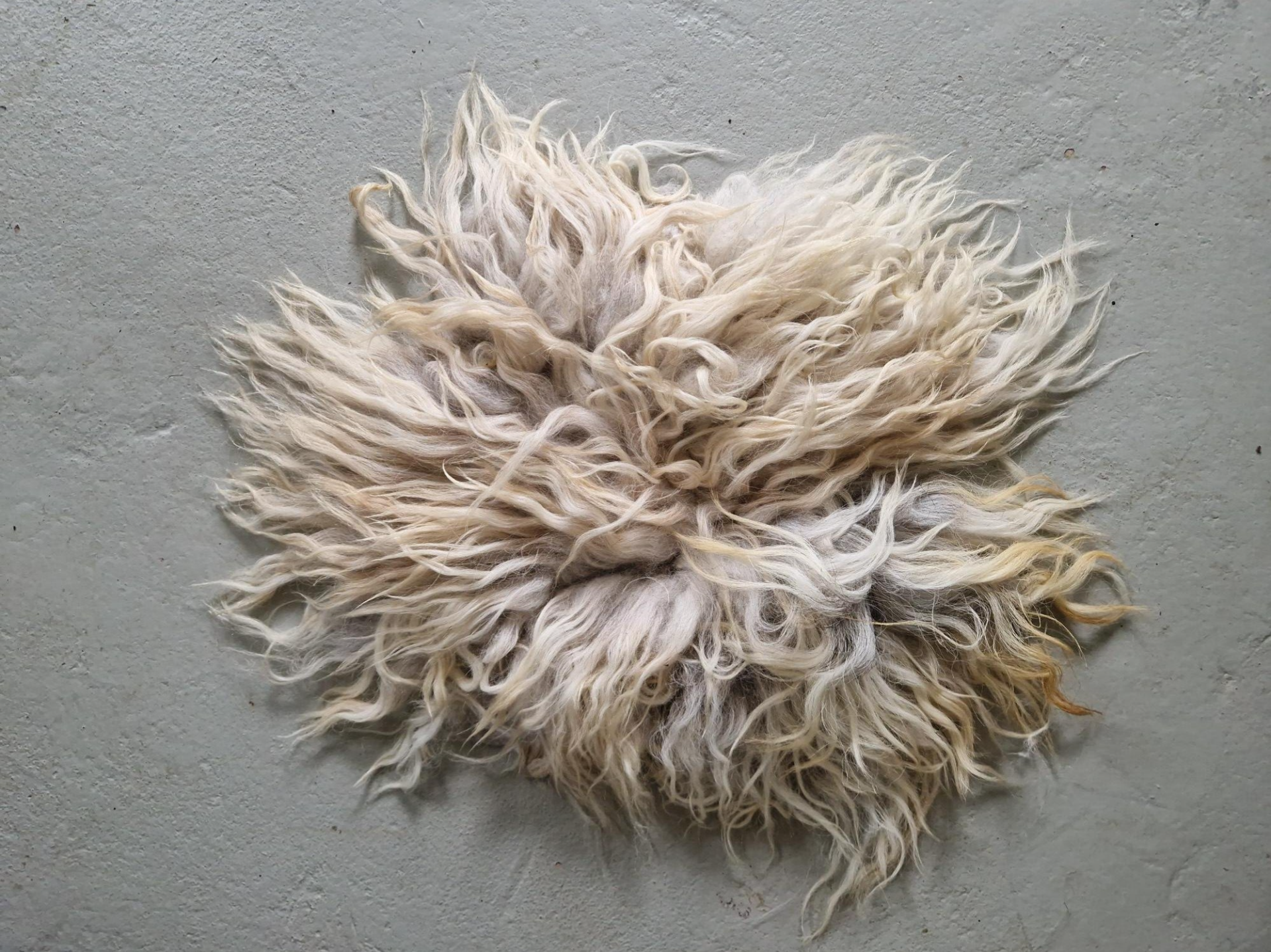 Vachtje met mooie lange lokken. Grijs in de basis, de lokken lopen uit naar (warmer) en goudblond.