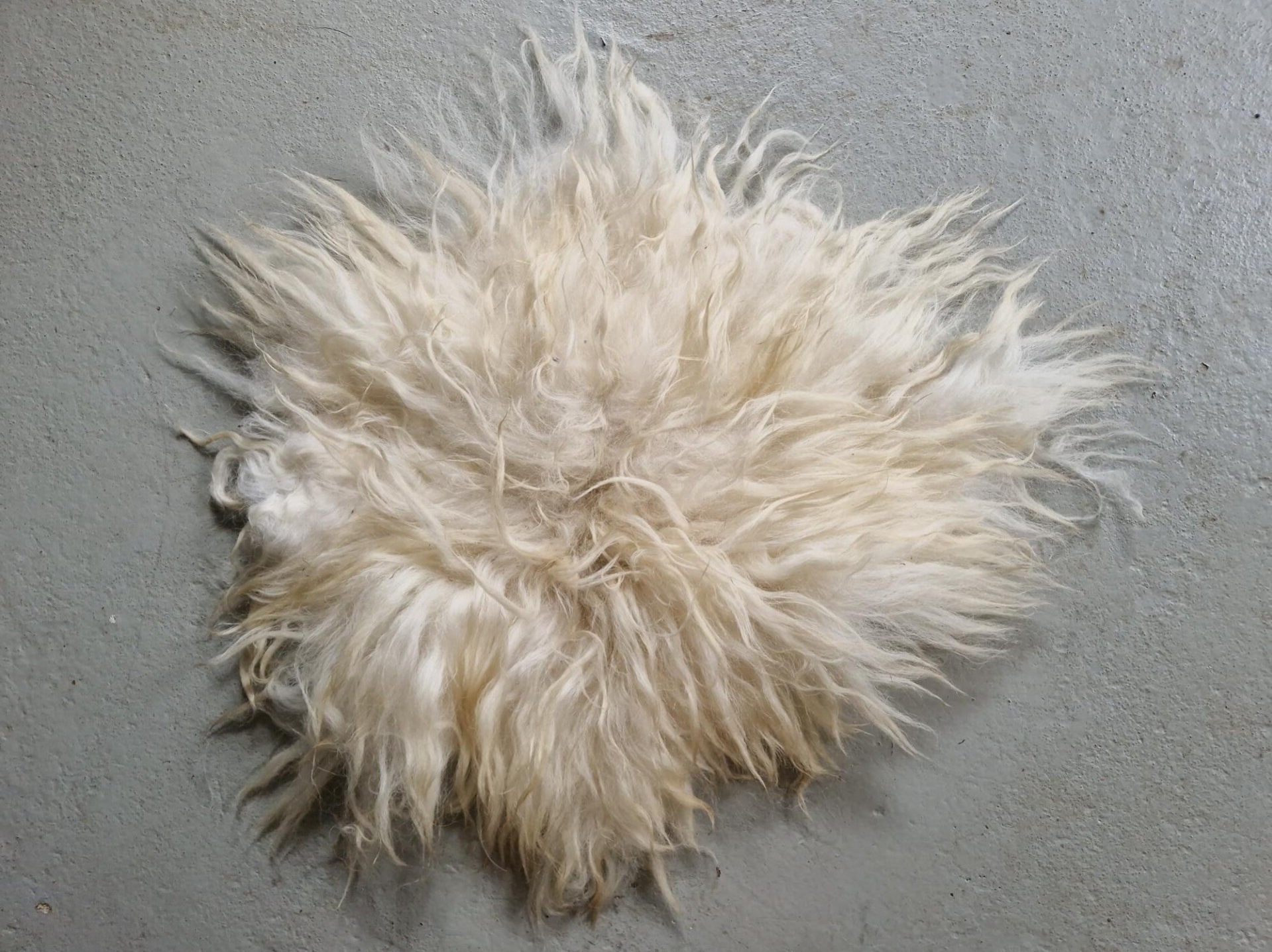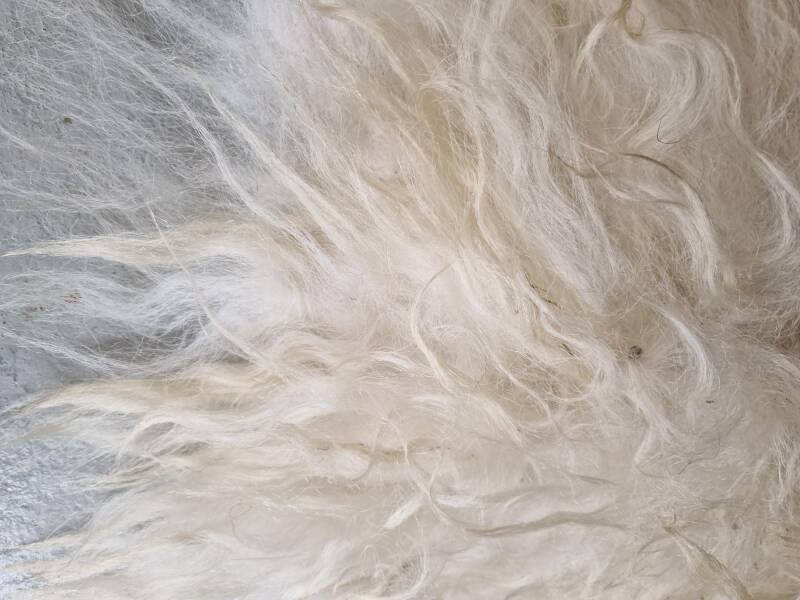 Vrij helder wolwit vachtje met fijne, lange lokken. Soepel gevilt, valt mooi.