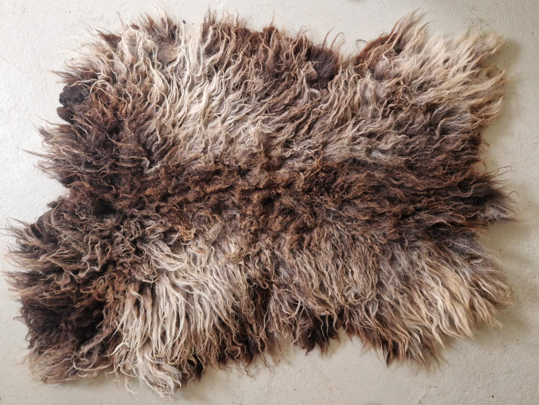 Soepele vacht die lekker zacht aanvoelt. In het nekgedeelte zitten nog wat zaadjes (zie foto), maar dit is niet storend en wel gewoon schoon. Warm bruin van kleur met sommige lokken vergrijsd.