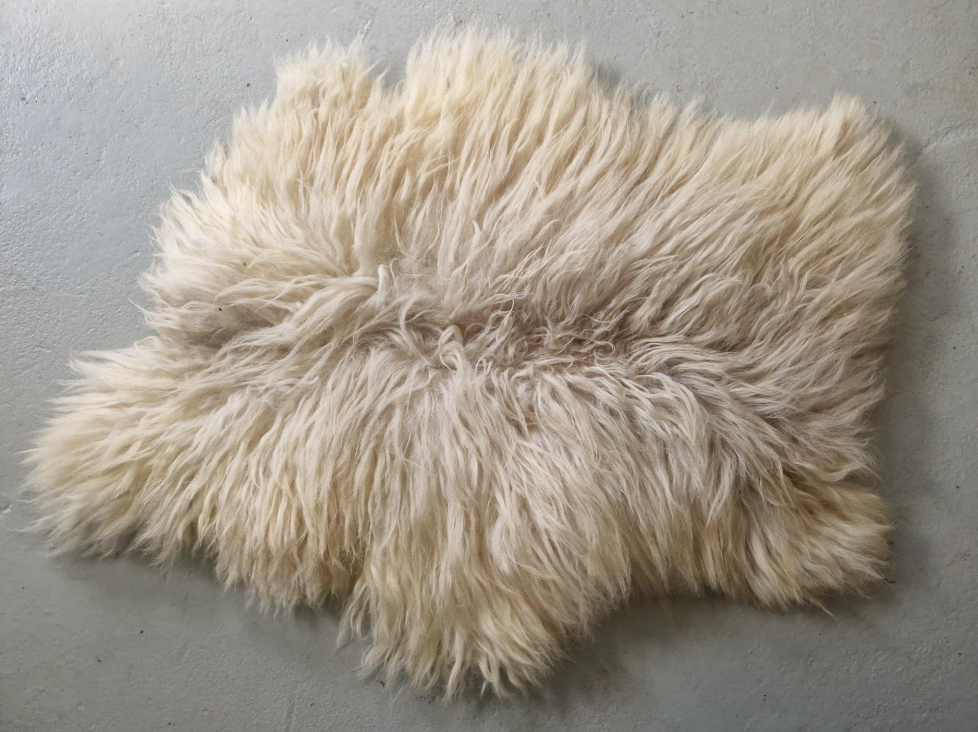 Volle vacht met wat dikkere, niet-gladde lange lokken. Wolwit met een tikje voskleurig in de basis, waardoor het extra warm oogt.