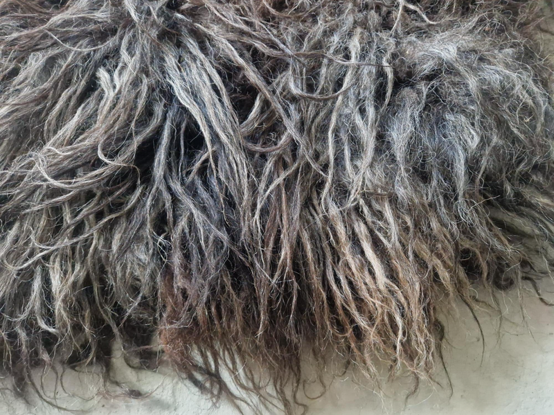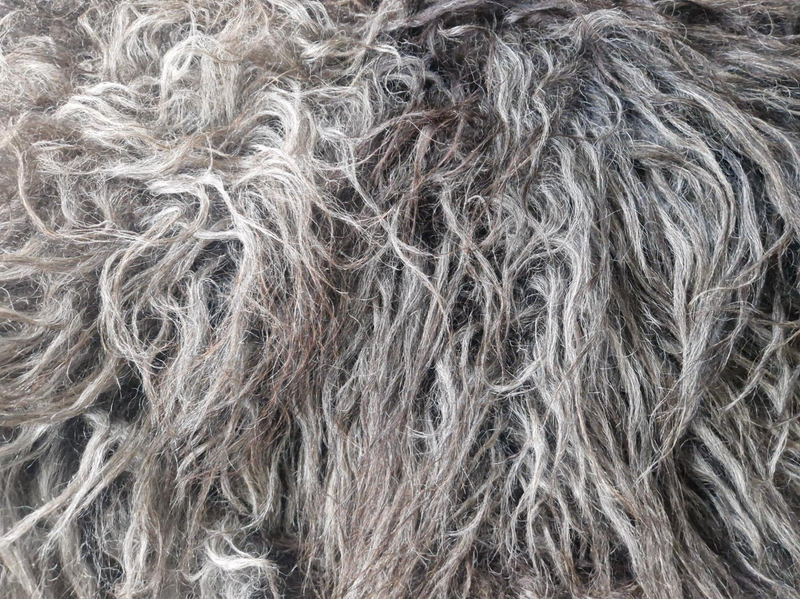 Donkere, dikke maar toch soepele vacht in donkergrijs en bruin. Mooie lange lokken over de gehele vacht.