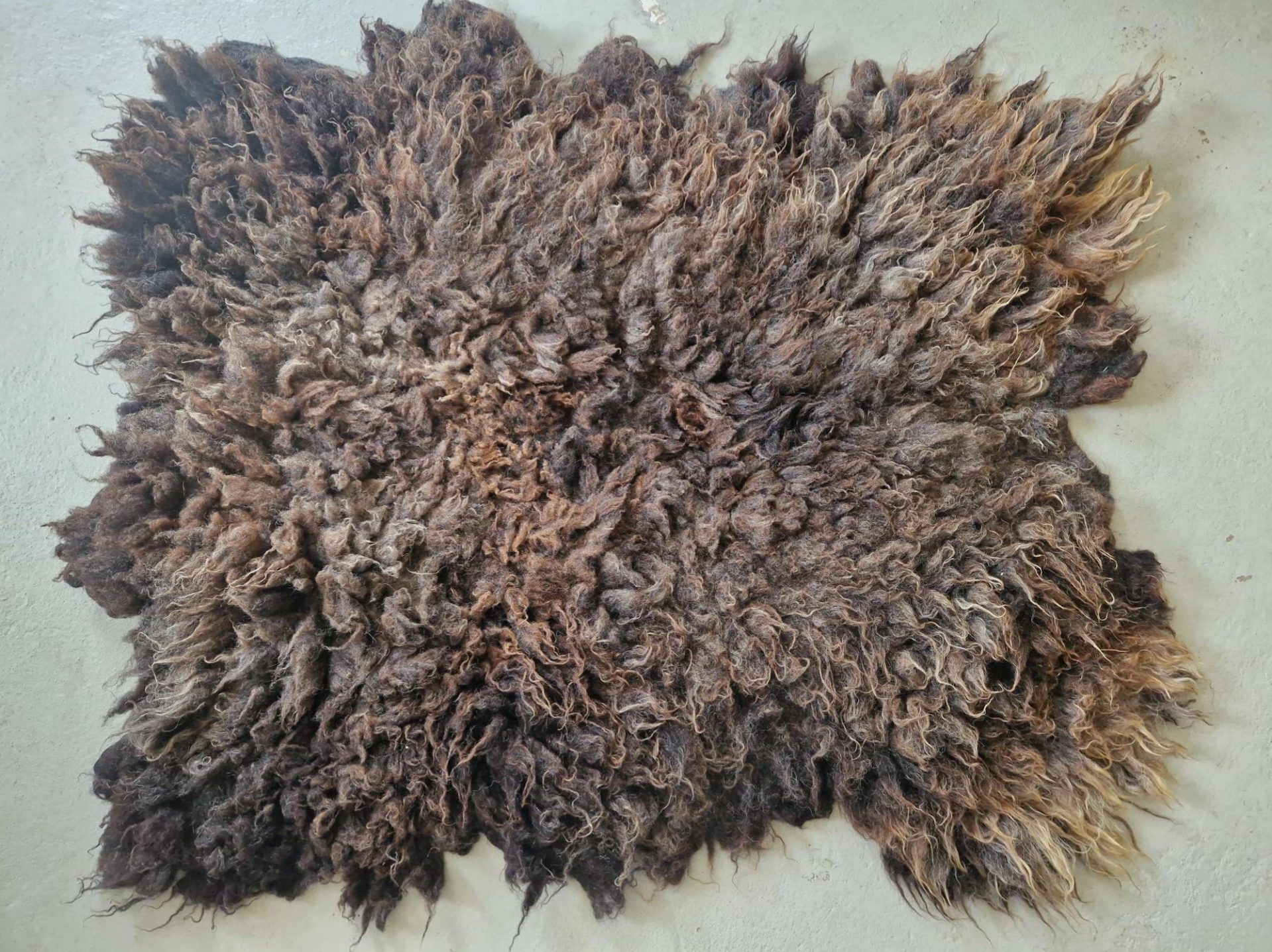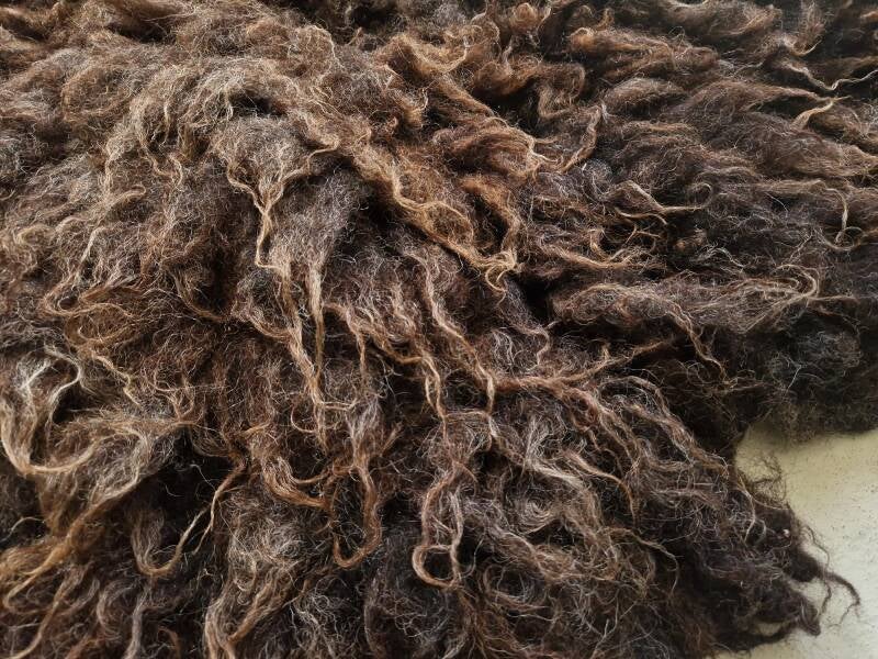 Vacht met kortere tot halflange lokken. Heel donkerbruin in de basis, uitlopend naar bruin en donkergrijs. De lokken zijn typisch Schoonebeeker, dus niet glad maar wat stoerder.
