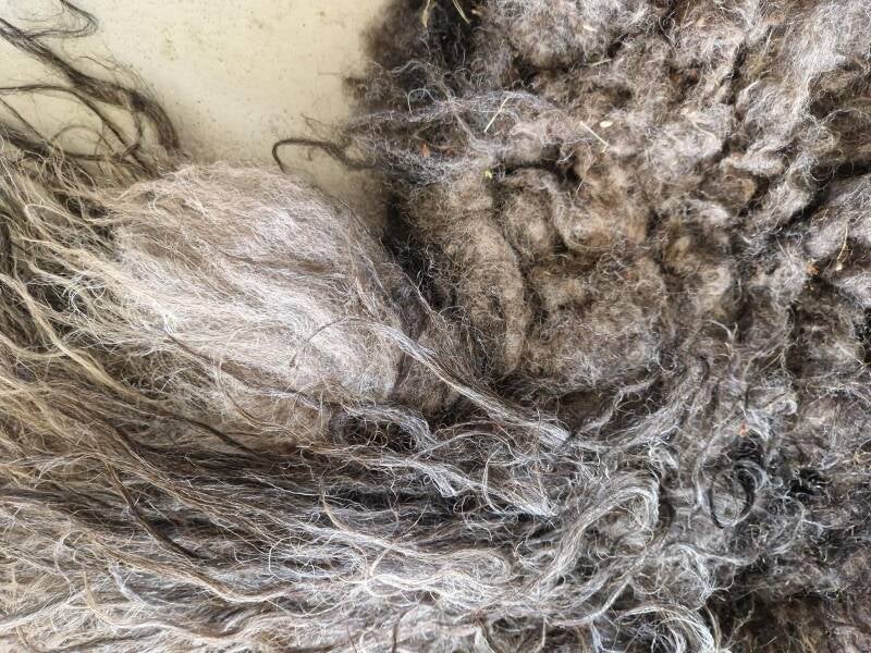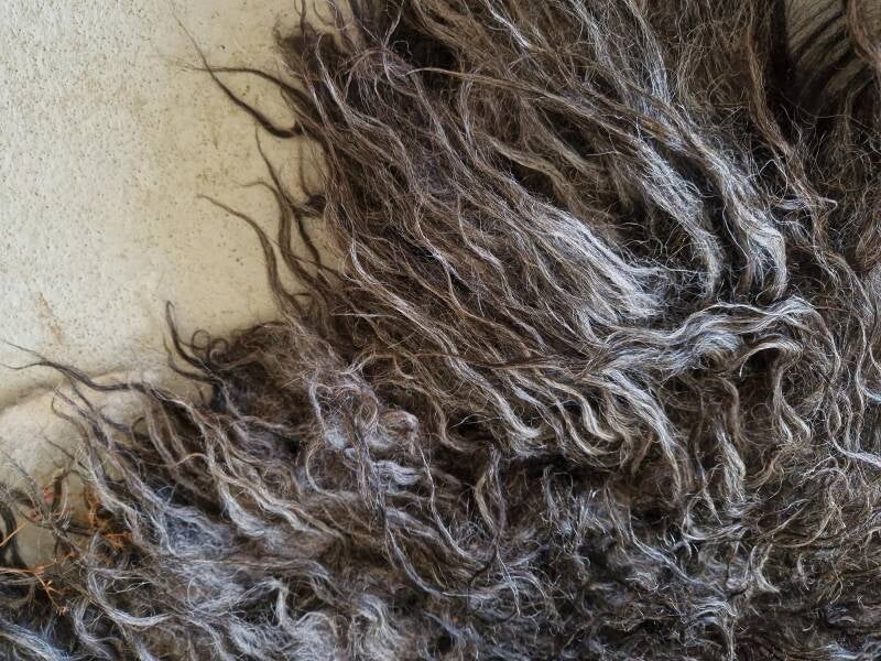 Prachtige veelal antracietgrijze, lange lokken. Bij de achterpoten iets lichter, net als in het nekgedeelte. Daar is ook een deel al wat natuurlijk vervilt, wat een extra stoer uiterlijk geeft.