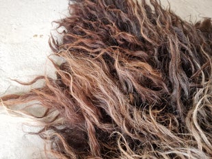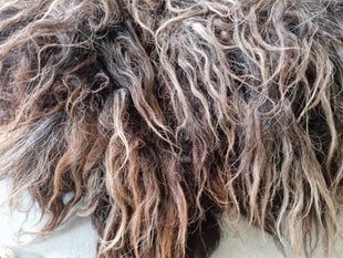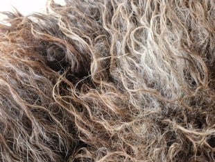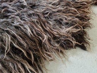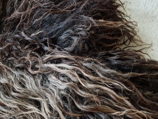 Donkergrijs met donkerbruin en zachte, lange lokken over de gehele vacht.
