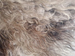 Halflange tot lange, wat ruige lokken. Niet glad. Prachtig gemêleerd in grijs, taupe, bruin en zelfs wat blond. In het nekgedeelte zitten nog wat zaadjes ( zie foto met mijn hand), dit is echter niet storend (het schaap loopt op de heide).