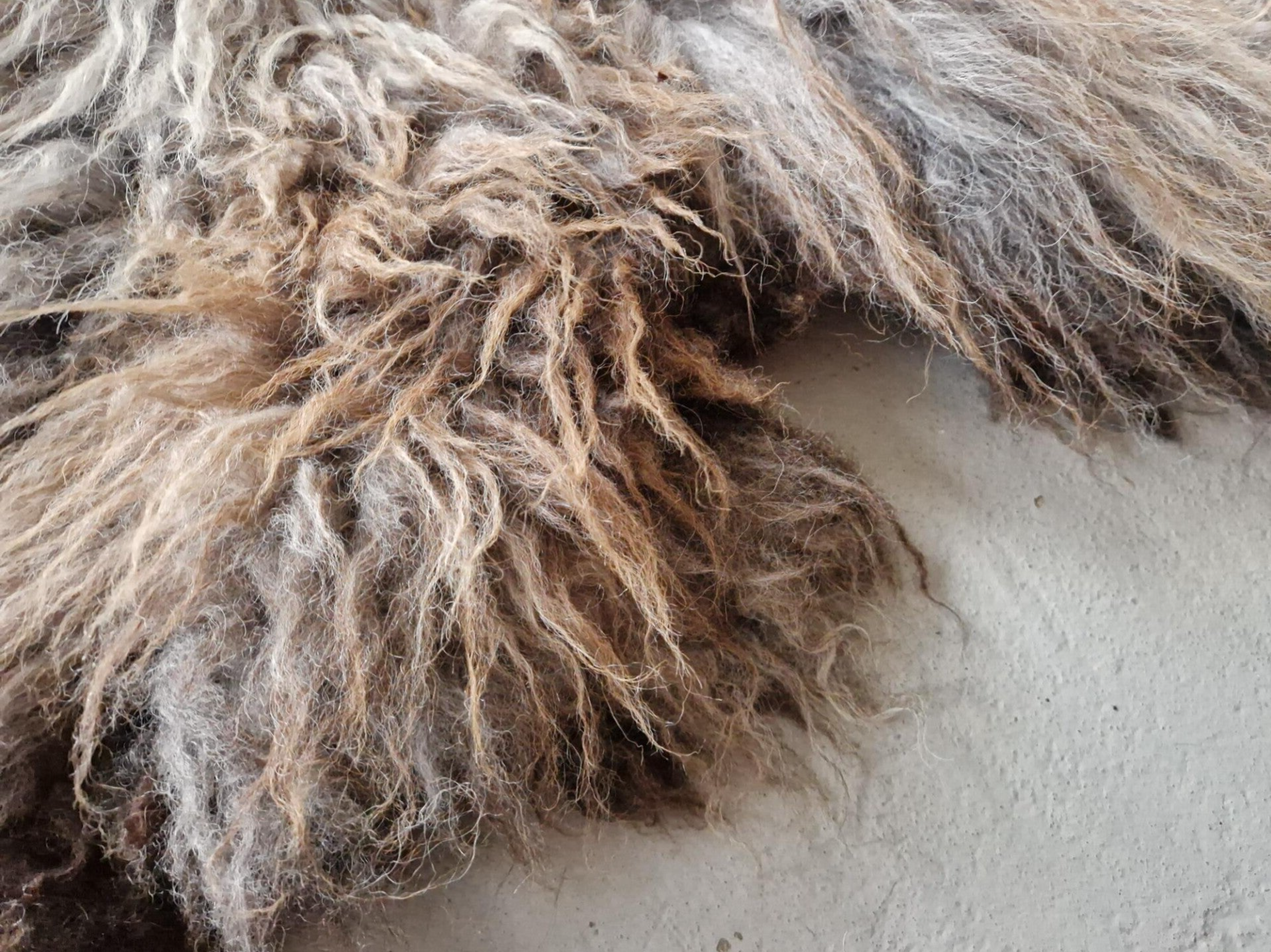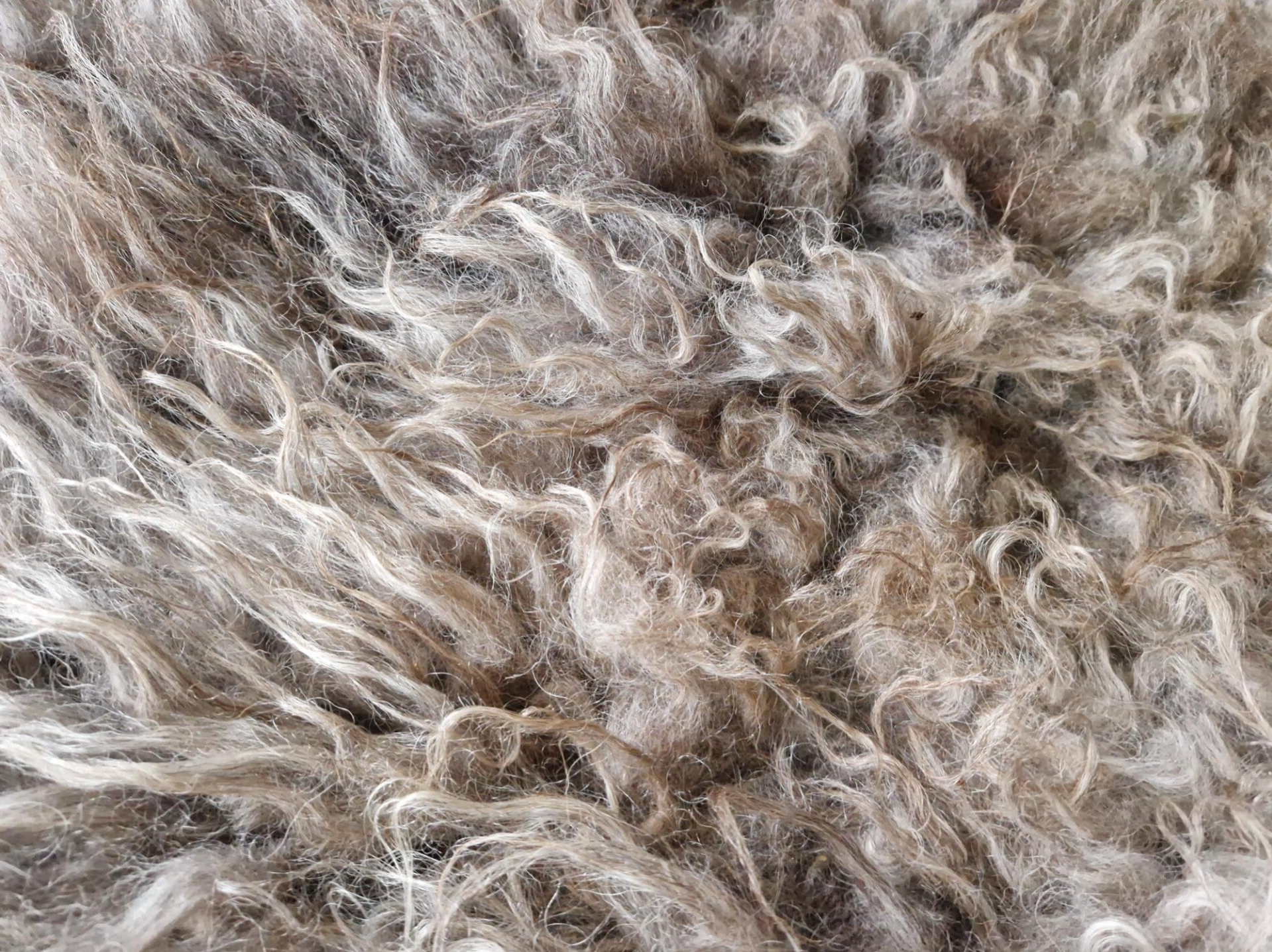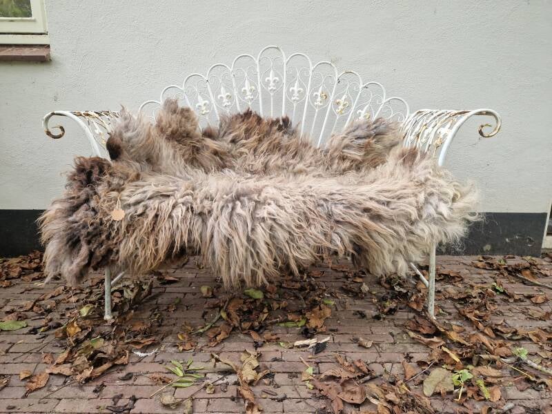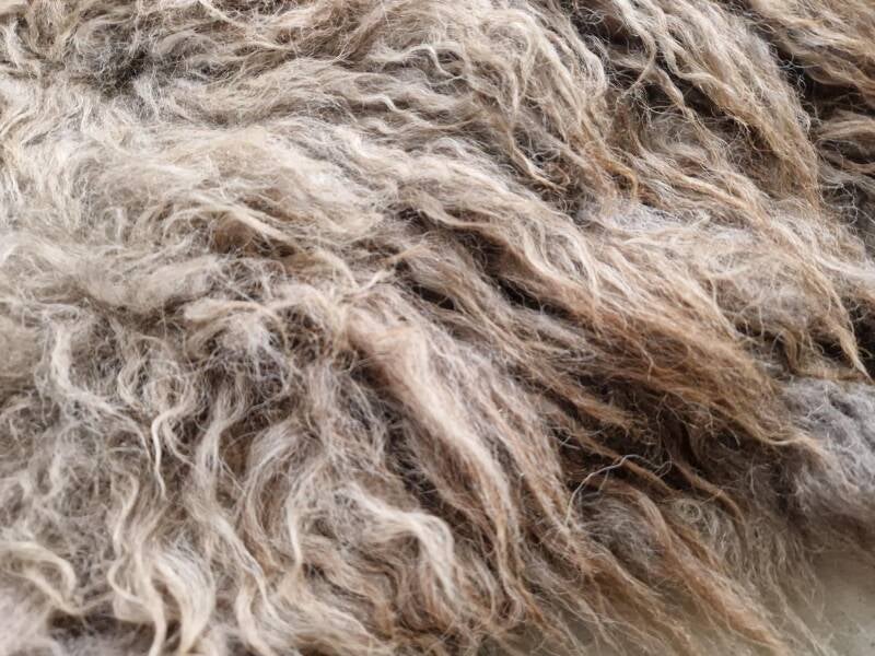 Grote vacht met kortere tot halflange lokken in beige, taupe, lichtbruin en wat grijzig in de basis. Stevig maar toch soepel gevilt, voor zowel op de bank, stoel of op de grond geschikt. De lokken zijn niet glad maar juist wat ruiger.